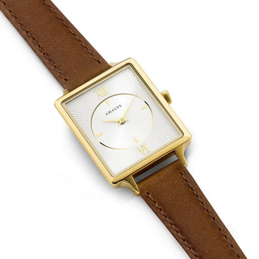 La Amalys Montre Femme Mathilda- AMW-130 est une conception élégante et raffinée caractérisée par son affichage analogique. Mettant en valeur une belle couleur Marron pour le bracelet en cuir, il est assorti à un boîtier couleur doré en acier qui affiche des dimensions de 23 x 28 mm. Le boîtier rectangulaire aux coins légèrement arrondis présente une certaine douceur, accentuant son allure féminine. Dotée d’une étanchéité de 3 ATM, cette montre est idéale pour une utilisation quotidienne sans crainte de l’eau. Elle fonctionne grâce à un mouvement Quartz précis et fiable. La fermeture se fait via une boucle simple, assurant un port sûr et confortable. Notez le verre minéral qui protège le visage de la montre, optimisant sa durabilité.