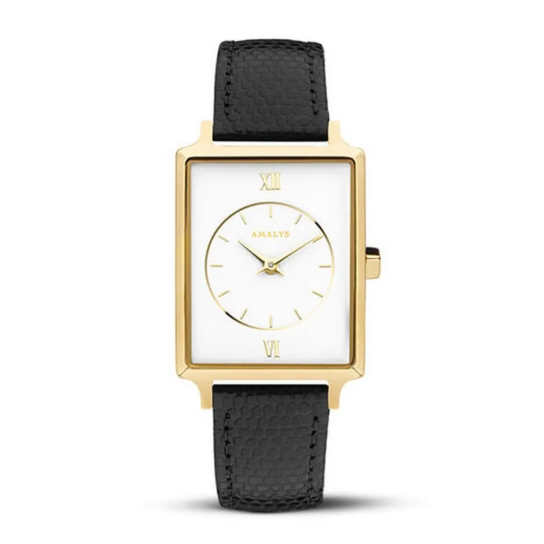 La Montre Femme Amalys Noémie – AMW-154 de la maison de haute horlogerie Amalys Montre est un sublime bijou avec un affichage analogique. Brillamment logé dans un boîtier doré en acier inoxydable, le cadran noir profond est protégé par un verre minéral. Le mouvement à quartz garantit une excellente précision du temps. Le bracelet de la montre est fabriqué en cuir de haute qualité de couleur Noir, fixé d’une boucle simple pour une assurance supplémentaire. Mesurant 23 x 28 mm, le boîtier rectangulaire renforce l’élégance de cet accessoire. Cette montre est parfaitement étanche jusqu’à une profondeur de 30 mètres. Parfaite pour la femme moderne qui aime allier raffinement et fonctionnalité.
