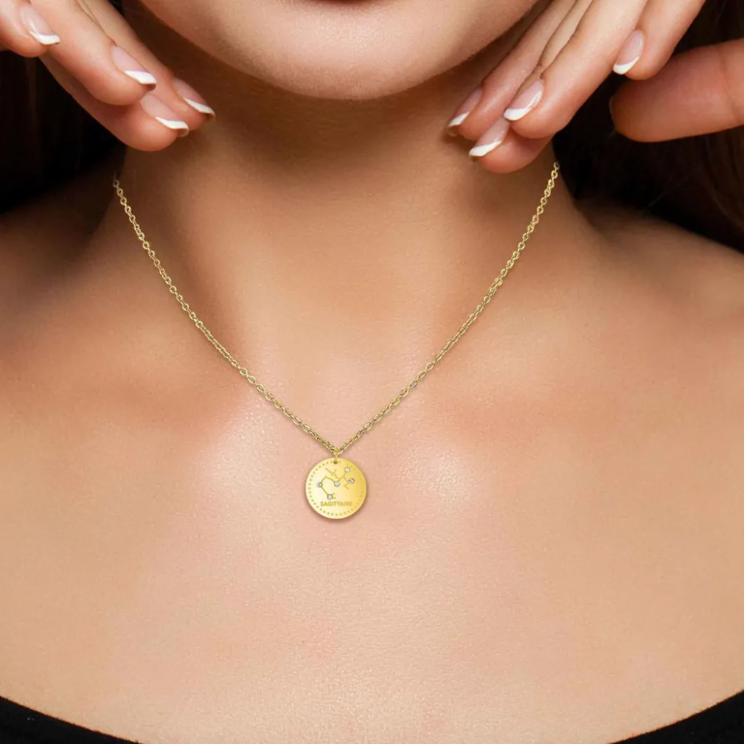 Voici le Collier et pendentif Athème B2449-SAGITTAIRE Femme, un bijou original et intemporel composé d’une chaine en maille forçat et d’un médaillon gravé, magnifié par des cristaux de bohême luisants. Ce modèle habille le cou avec finesse et sublime le décolleté.