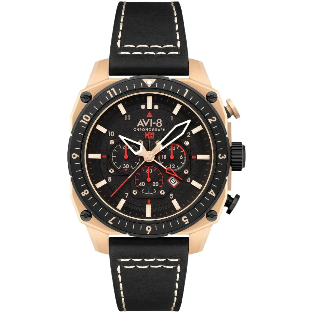 La Montre Homme AVI-8 s’adresse à l’homme moderne qui apprécie une combinaison de classe et de robustesse. Avec son boîtier rond doré rose de 44 mm en acier, cette montre offre un style unique et un affichage analogique clair. Le bracelet en cuir noir lui donne une élégance intemporelle. La montre AVI-8 Hawker Hunter Atlas Dual Time Chronograph est alimentée par un mouvement à quartz pour une précision constante. Grâce à son verre minéral résistant et à une étanchéité de 50 m (5 ATM), elle est conçue pour résister aux rigueurs du quotidien. Sa boucle simple garantit un port sûr et confortable. Le noir du bracelet ajoute un contraste saisissant avec le boîtier doré rose, tandis que les détails finement gravés sur le cadran témoignent de la qualité artisanale d’Avi-8.