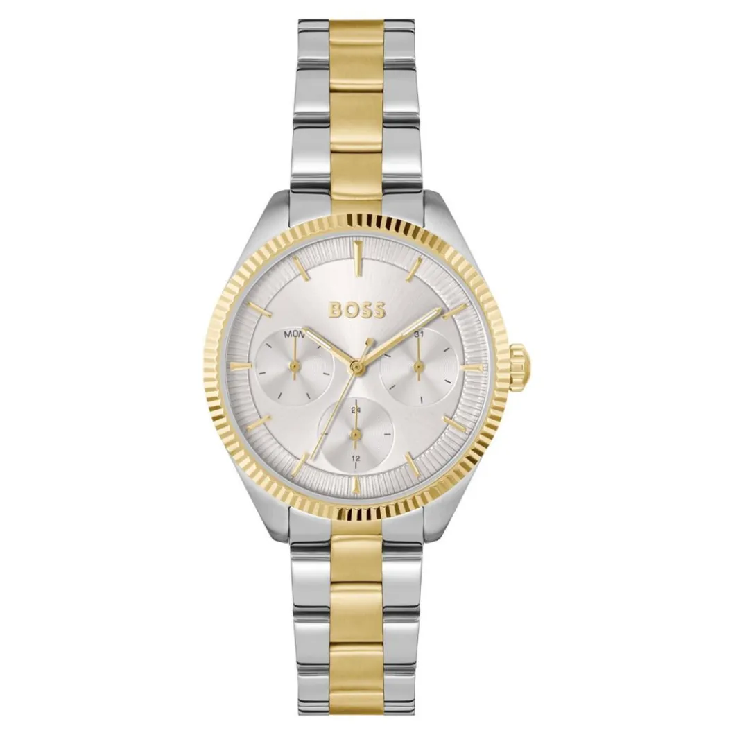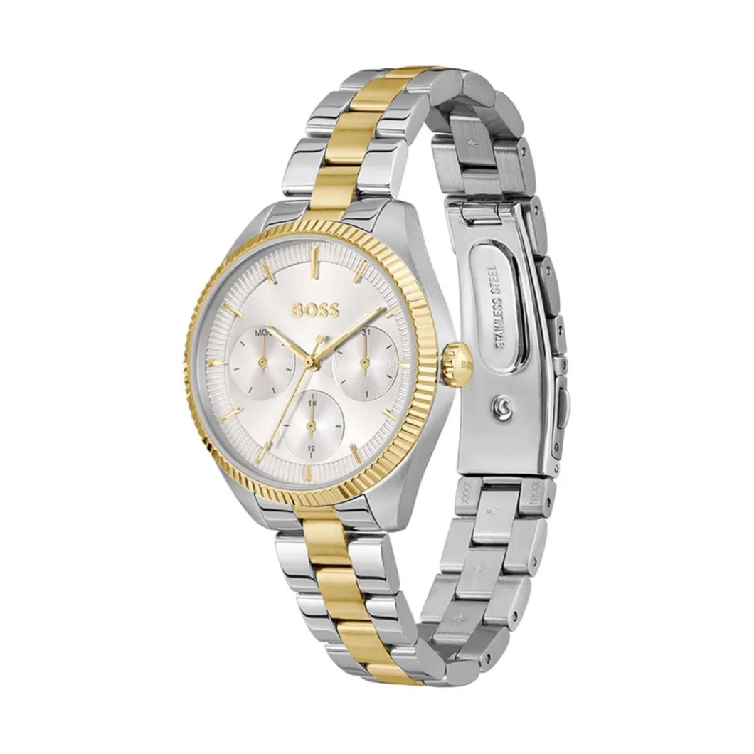 La Montre Femme Boss Sage Sport – 1502804 est un choix élégant pour toute femme qui cherche à compléter son style avec une montre polyvalente et impressionnante. Le boîtier rond en acier argent d’un diamètre de 34 mm encadre un affichage analogique, posé sur un bracelet en acier aux teintes argent et doré. Cette montre, dotée d’une étanchéité jusqu’à 30 m (3 ATM), fonctionne grâce à un mouvement à quartz, garantissant une précision inflexible. Le type de fermeture est une boucle déployante, facilitant ainsi son utilisation au quotidien. Le verre minéral de haute qualité protège l’écran de la montre, perpétuant l’éclat de cette création de marque Boss.