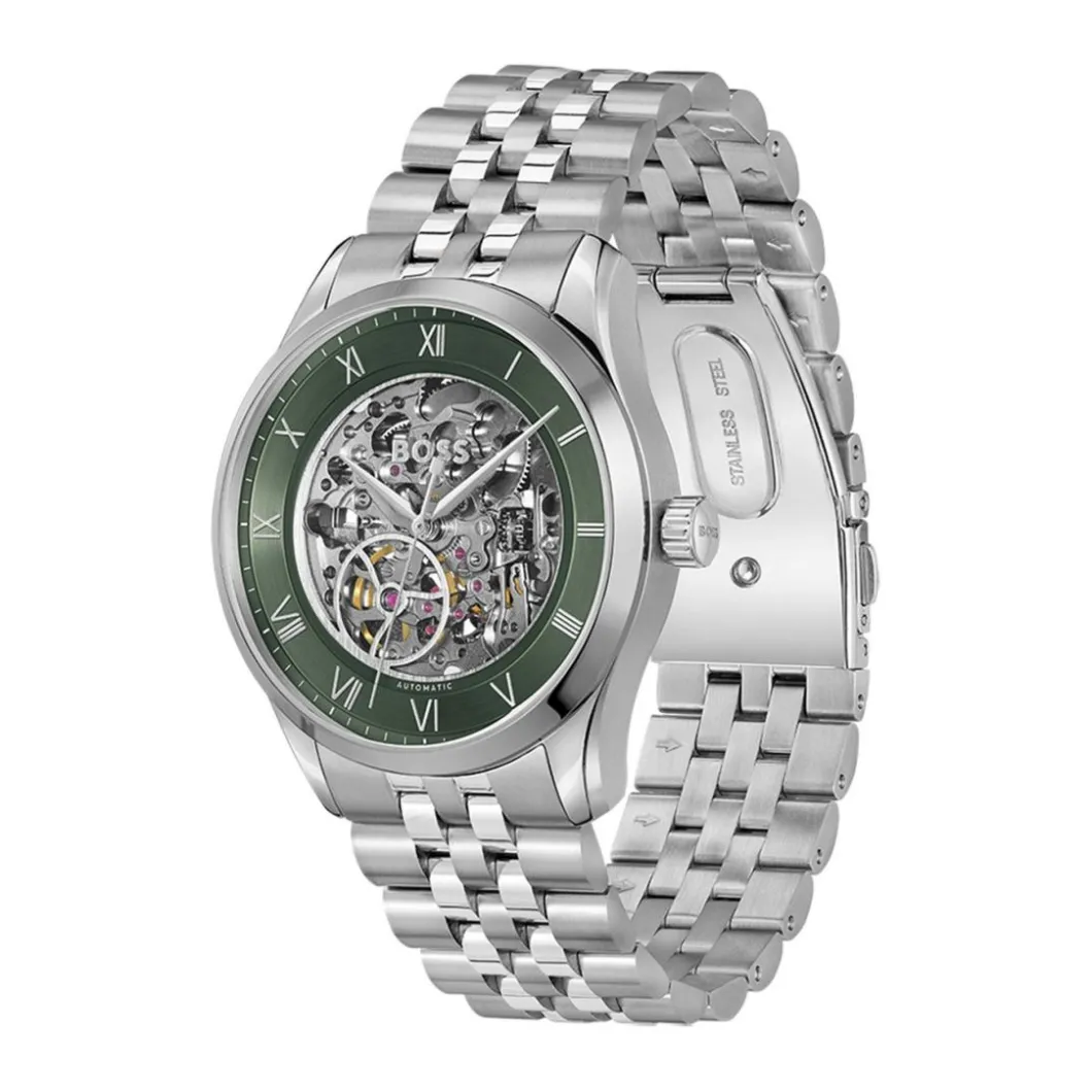 Adoptez un style sophistiqué avec le Montre Homme Boss Principle Skeleton – 1514236 Bracelet Acier Argent de la vénérable marque Boss. C’est une pièce élégante avec un boîtier rond en acier argent de 41mm de diamètre. La montre présente un affichage analogique net avec une fonction de dateur. Le bracelet en acier argent, assorti au boîtier, ajoute à l’aspect élégant. Propulsée par un mouvement automatique, elle est étanche jusqu’à 50 mètres. Nous notons aussi la présence d’une boucle déployante pour un port ajusté et d’un verre minéral pour une protection robuste. La couleur Argent ajoute une finition propre à cette conception de montre luxueuse.