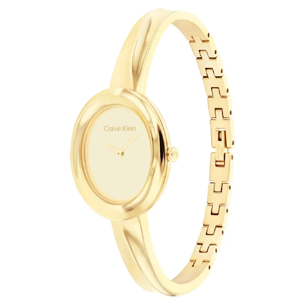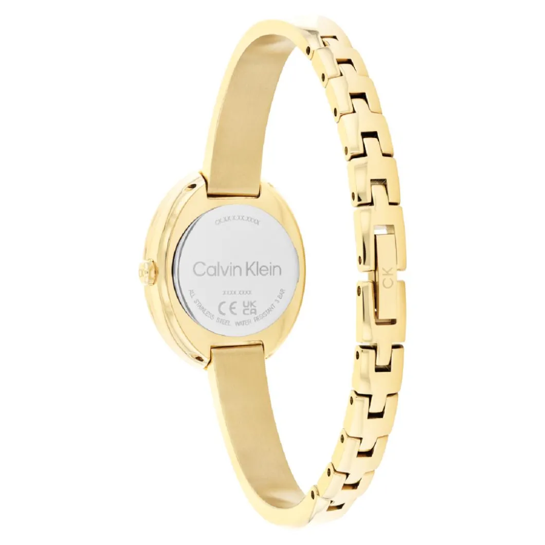Cette splendide Montre Femme Calvin Klein Montres Twisted Bezel – 25100056 est conçue en Acier Doré, arborant un design élégant et contemporain. La couleur du bracelet et du boîtier doré reflète le chic raffiné de la marque Calvin Klein. Avec un diamètre de boîtier de 24 mm, sa forme ovale s’harmonise parfaitement à son cadran analogique. Ce bijou est équipé d’un mouvement quartz de haute précision, assuré par une boucle déployante pour un confort optimal. L’étanchéité garantie jusqu’à 30 m (3 ATM) en fait la garde-temps idéale pour la femme active quotidienne. Enfin, son verre minéral lui apporte une résistance supérieure.