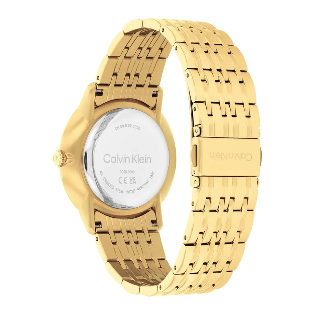 Voici une sublime montre pour homme signée Calvin Klein. Époustouflante avec son bracelet et son boîtier en acier de couleur doré, cette montre ajoute une touche d’élégance à n’importe quelle tenue. Elle comprend un boîtier de diamètre 40 mm, de forme ronde et un affichage analogique. Résistante à l’eau jusqu’à 30 mètres. Elle fonctionne grâce à un mouvement à quartz et se ferme par une boucle déployante. Le verre est minéral pour plus de durabilité.