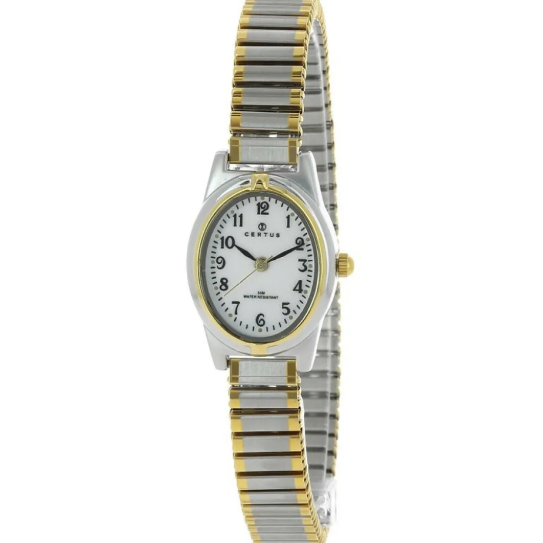 Montre Femme Certus 642385 avec son bracelet en acier argenté et doré, boîtier acier et cadran blanc.