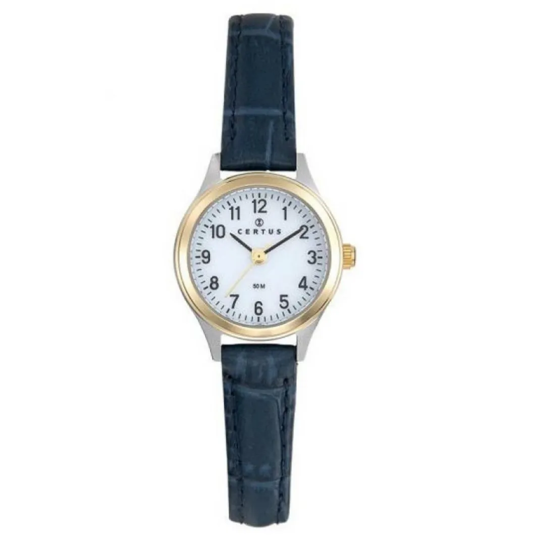 Le bracelet en cuir de cette Montre femme 645364 – CERTUS est résistant et classe. Son cadran est clair et contraste avec ses index noirs et son boîtier doré.