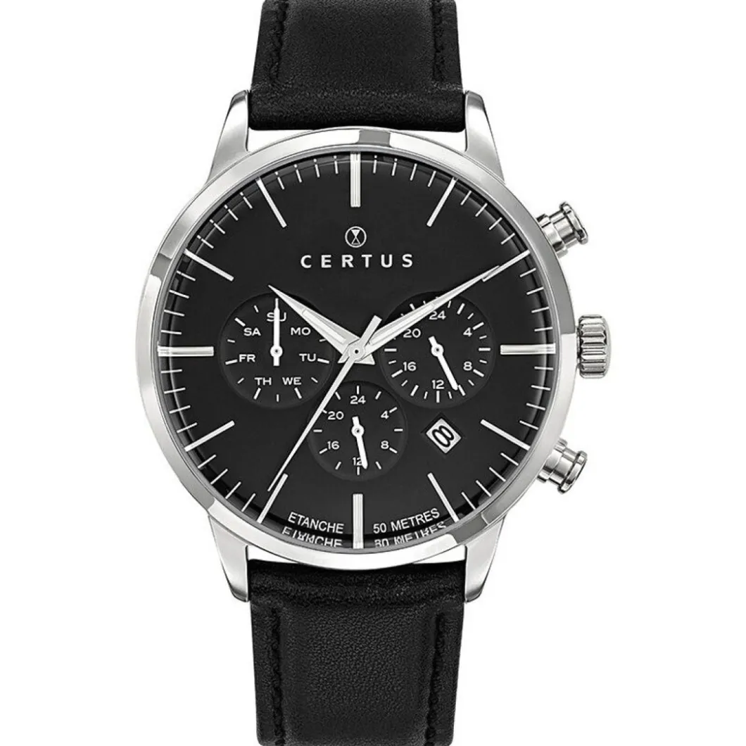 La Montre Homme Certus 611138 – Bracelet Cuir Noir vous suit partout et apporte à vos tenues une touche raffinée. Elle se distingue par son boîtier rond en acier et sa lunette en verre minéral bombé qui lui confère un look original et moderne. Le tout se pose sur un bracelet en cuir lisse noir qui assure confort et légèreté durant son port. Cette montre multifonction dispose de 3 cadrans dont un compteur 24h, fuseau horaire, dateur ainsi qu’un affichage analogique à aiguille classique. Elle s’équipe également d’un remontoir sur le côté qui facilite son réglage.