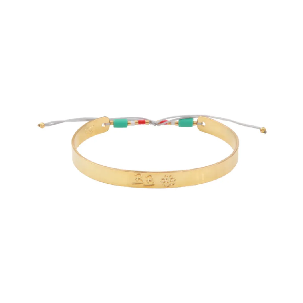 Ce modèle en forme de jonc s’orne de jolies gravures de fleur et des initiales BB qui accentuent son charme. Le tout se ferme à l’aide de lien ivoire avec pierre synthétique turquoise et rouge.