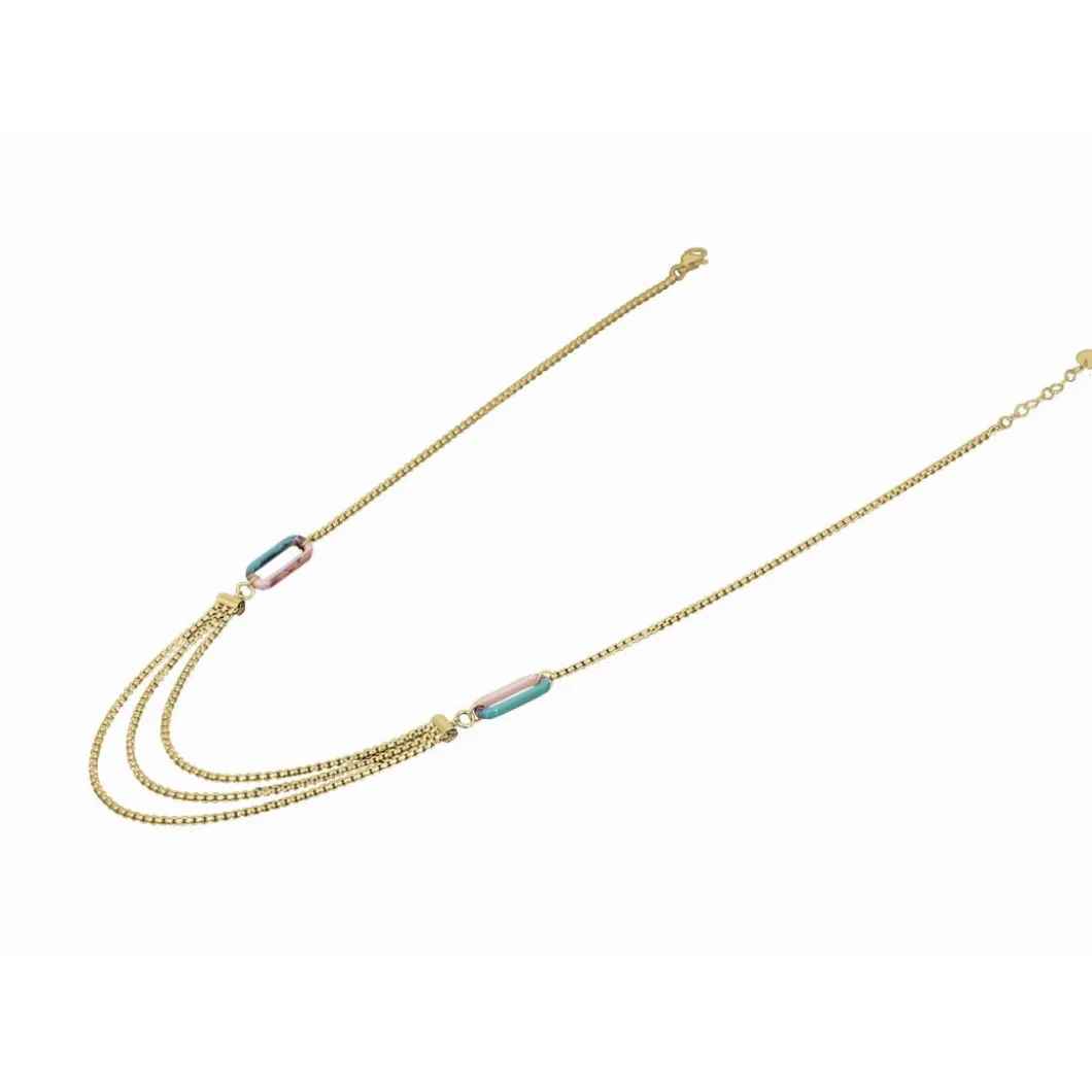 Le Collier Bohème Acier Doré 3 Chaines 46/48/50 + 3 cm Et Résine de la marque Clyda est conçu spécialement pour les femmes. Ce collier de type pendentif arbore une charmante couleur Dorée, offrant un attrait distinct à votre tenue. La structure en Acier garantit une durabilité impressionnante. Les trois chaines successives de différentes longueurs ajoutent une touche de sophistication à ce bijou.