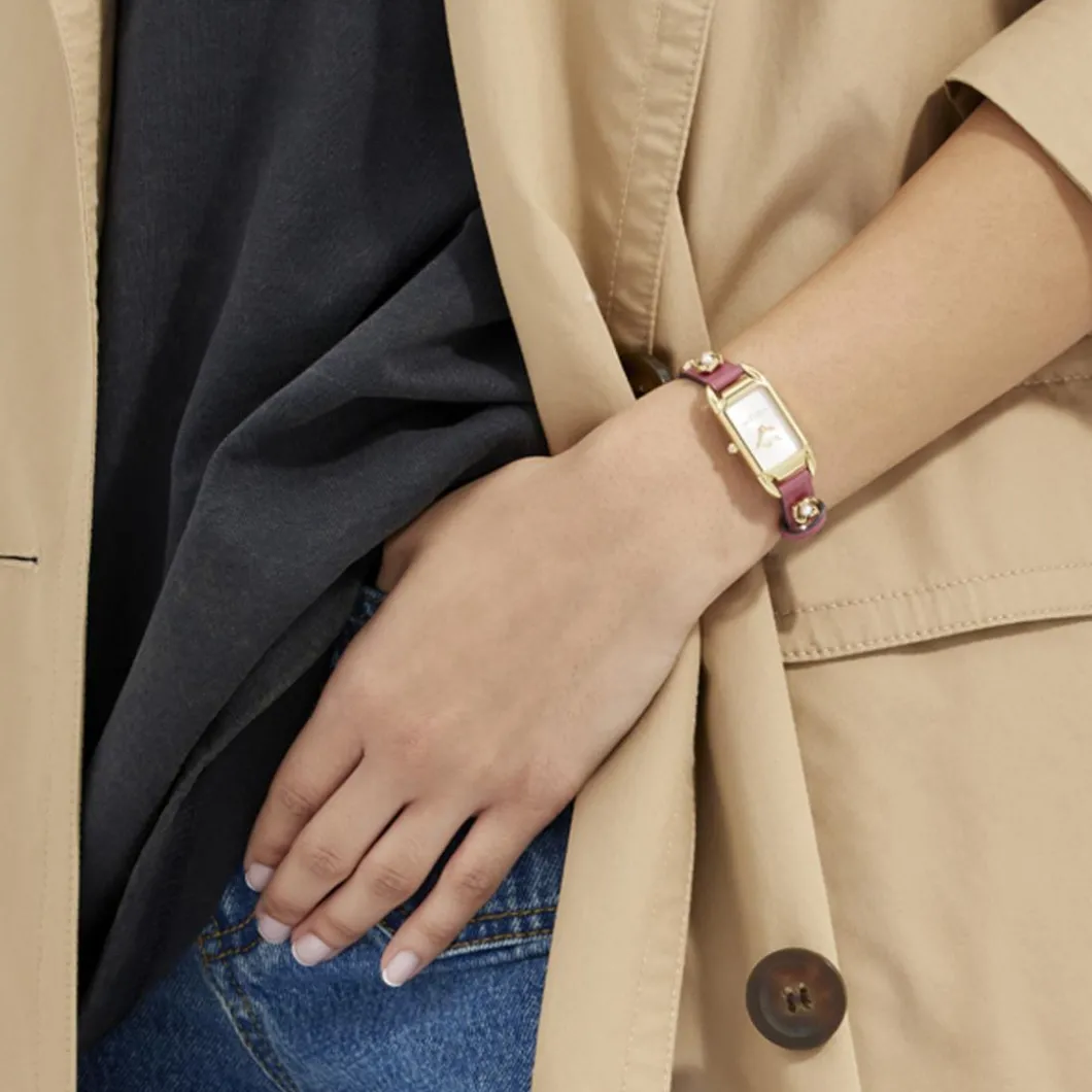 Découvrez la sophistication avec la montre femme Cadie – 14504117 signée par la fameuse marque Coach. Cette pièce élégante présente un affichage analogique sur un boîtier rectangulaire, avec sa couleur dorée rose apportant une chaleur chic. Le boîtier en acier, de 18mm de diamètre, est résistant et arbore une étanchéité de 30m (3 ATM). Le bracelet en cuir rose apporte un contraste charmant, complétant le look féminin de cette montre. Son mouvement à quartz garantit une précision fiable tandis que le verre minéral protège le cadran des éraflures. Avec sa fermeture de type boucle simple, son enfilage et son retrait seront faciles. Cette montre est à la fois une déclaration de style et une délicatesse pratique.