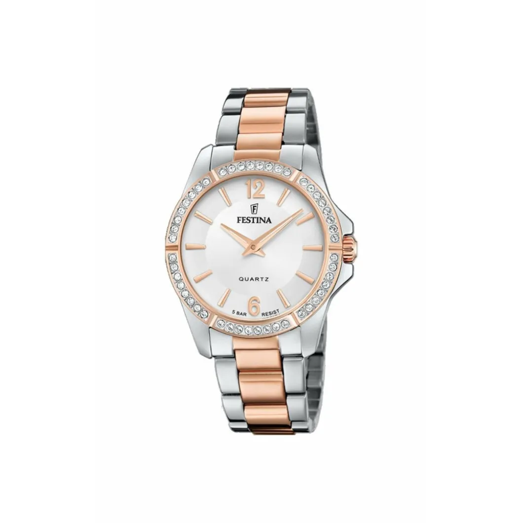 Avec une étanchéité de 5ATM, cette Montre F20595-1 Festina 02-017 MADEMOISELLE vous accompagnera partout. Elle se remarquera aisément grâce à l’éclat de sa lunette ornée de strass. L’affichage analogique de son cadran garantit une lecture facile de l’heure. On craque pour son design bicolore.
