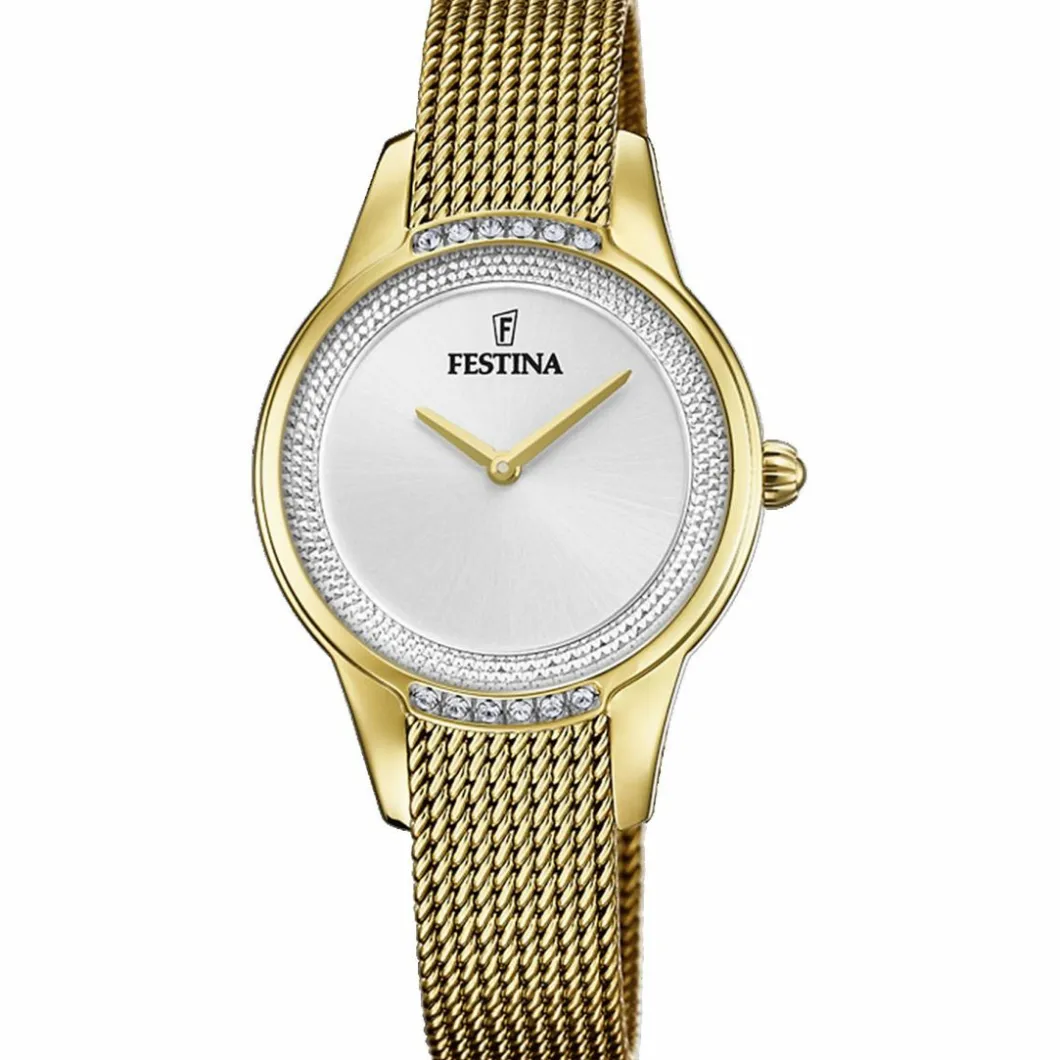 La précision et l’élégance sont au rendez-vous avec cette Montre femme Bracelet Acier Doré F20495-1. Son cadran blanc est livré avec un pourtour incrusté de pierres blanches. La lunette circulaire qui accompagne son boîtier arbore également des reflets brillants.