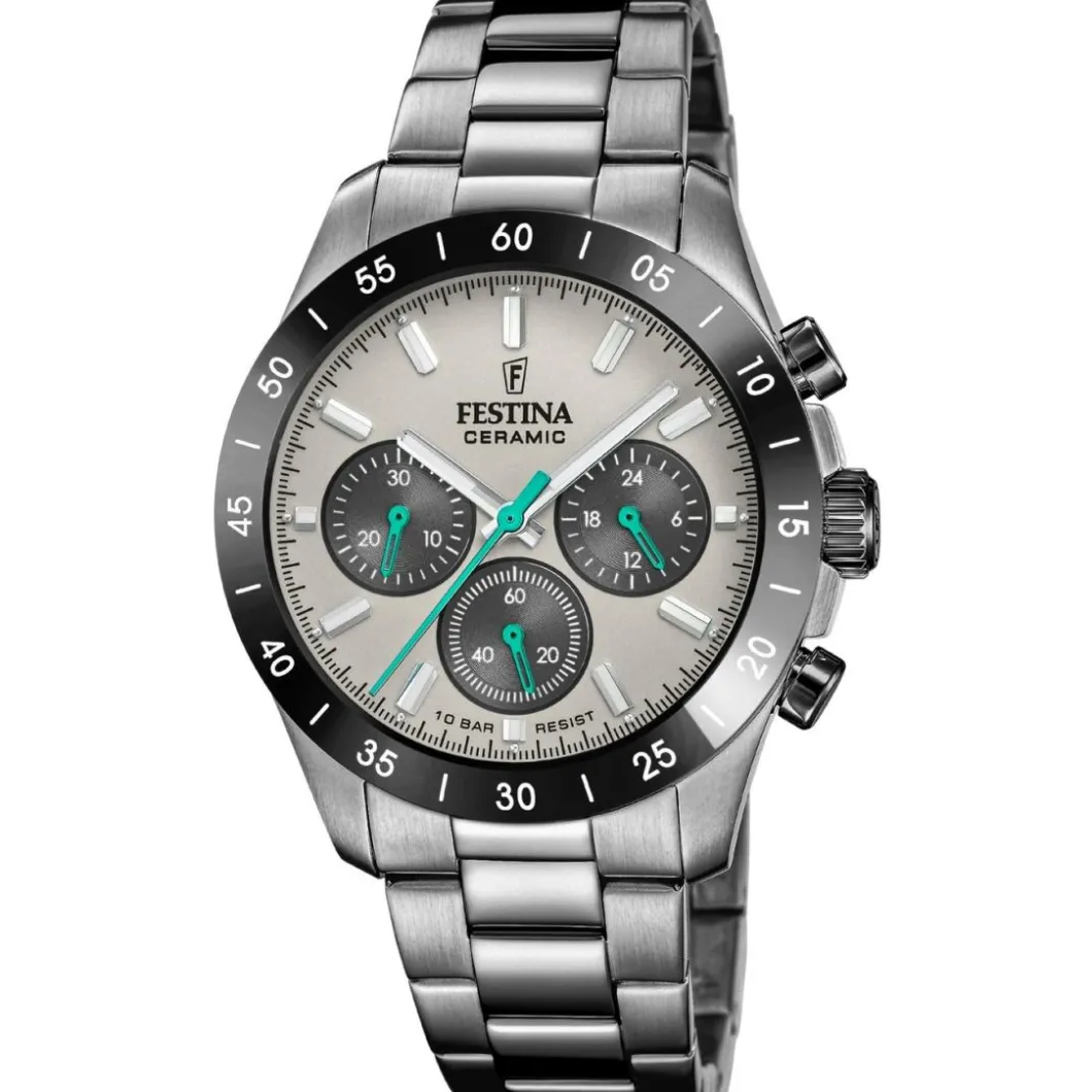 Le produit proposé est une montre pour femme de la marque Festina. Il s’agit du modèle Festina Ceramic – F20703-1. La montre est montée sur un bracelet en acier de couleur gris. Le boîtier de forme ronde, aussi en acier, a un diamètre de 39 mm. L’affichage est analogique et le mouvement est à quartz. La montre est dotée de la fonctionnalité de chronographe. Elle est étanche jusqu’à 100 m, soit 10 ATM. Le type de fermeture est une boucle déployante. Le verre qui protège le cadran est en minéral. Sa teinte gris métallisé lui confère une élégance discrète.