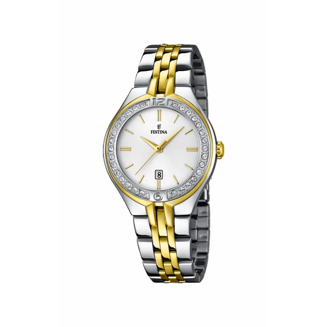 La Montre Femme Festina Mademoiselle F16868-1 est un modèle élégamment féminin. Son boîtier agrémenté de cristaux blancs porte un bracelet en acier argenté et doré. Sa couleur lumineuse est assortie avec celle de son cadran muni d’un dateur.
