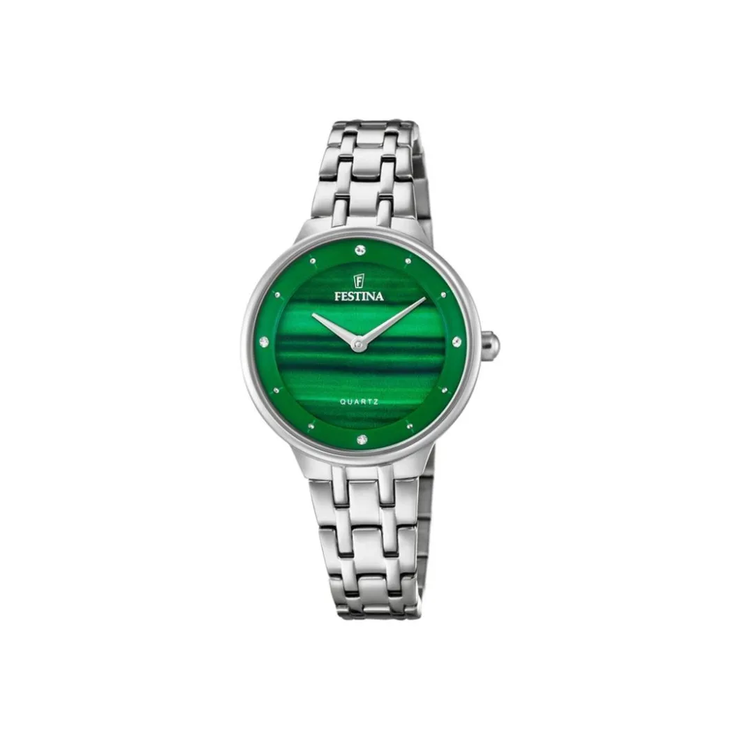 Cette Festina Mademoiselle F20600-B combine beauté et élégance intemporelle pour la femme moderne. Au poignet, l’acier argent du bracelet et du boîtier de 31mm attire immédiatement l’attention. Le cadran est également en argent, avec un affichage analogique simple mais sophistiqué qui est alimenté par un mouvement quartz. La montre est dotée d’une boucle déployante pour un enfilage en douceur. Elle bénéficie également d’une étanchéité de 5 ATM, la rendant résistante à l’eau jusqu’à 50 mètres. Enfin, le verre minéral protège le cadran, ajoutant une couche supplémentaire de durabilité à cette montre féminine polyvalente.