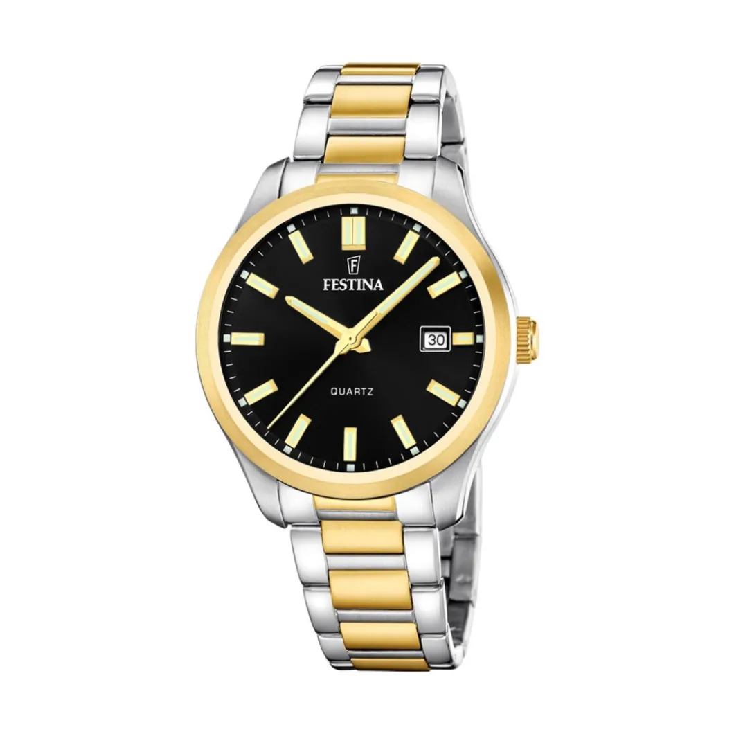 L’élégante Montre Homme Festina Acero Clasico – F20738-4 confectionnée par Festina propose une esthétique prestigieuse avec son bracelet acier bicolore. La montre se distingue par son affichage analogique clair et son boitier rond de 42mm. Fidèle aux standards de qualité de la marque, son boitier et bracelet sont conçus en acier robuste. Sa fonctionnalité dateur ajoute une touche de praticité au design. L’étanchéité du modèle est de 50 m (5 ATM), et son mouvement à quartz assure une mesure précise du temps. Cette montre pour homme se ferme avec une boucle déployante et est protégée par un verre minéral. La superbe couleur bicolore du boitier lui donne un aspect luxueux et moderne.