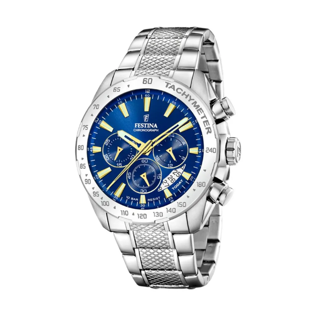 Cette montre pour homme Festina modèle F20668-2 se distingue par son bracelet en acier de couleur argent. Son boîtier rond, également en argent, d’un diamètre de 45 mm, encadre un affichage analogique. Dotée d’un mouvement quartz, cette montre présente une étanchéité jusqu’à 100 m. Ses fonctionnalités incluent un chronographe. Le système de fermeture est une boucle déployante et la montre est protégée par un verre minéral.