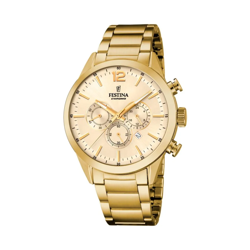 Misez sur un style sophistiqué avec cette Montre Homme Festina Timeless Chronograph – F20633-4 de Festina. Son design impressionnant commence par un boitier rond de 44 mm de diamètre en acier, délicatement poli qui luit en doré. Le bracelet assorti en acier doré ajoute un éclat supplémentaire à la montre, fixé au poignet grâce à une boucle déployante sécurisée. Elle est équipée d’un mouvement quartz et d’un affichage analogique, avec également un précis chronographe. La montre est protégée par un verre minéral résistant et bénéficie d’une étanchéité remarquable jusqu’à 50 m (5 ATM). C’est l’accessoire parfait pour les hommes qui veulent rendre leur quotidien plus élégant.