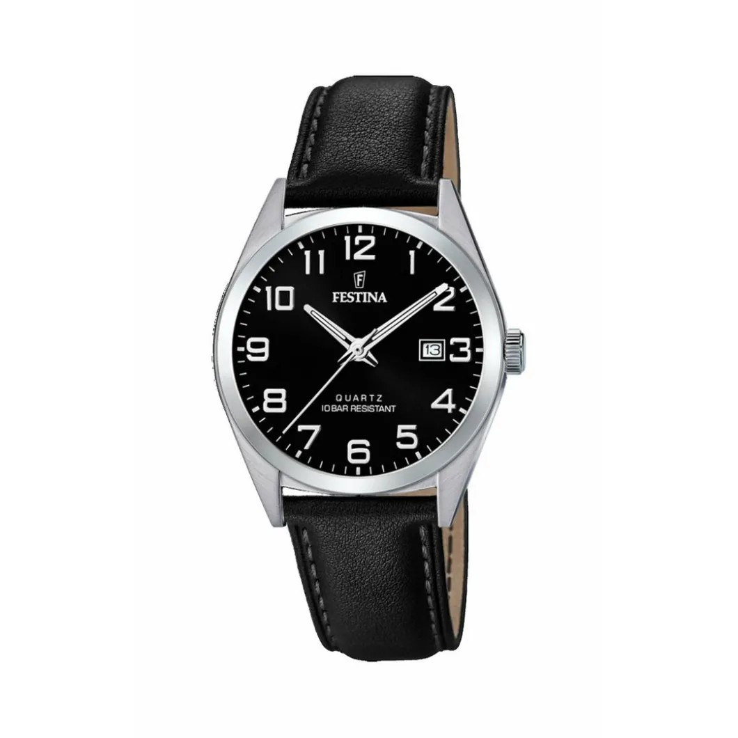 Montre Festina F20446-3 – CLASSIQUE Dateur Boîtier Acier Argenté Bracelet Cuir Noir Cadran Noir Homme