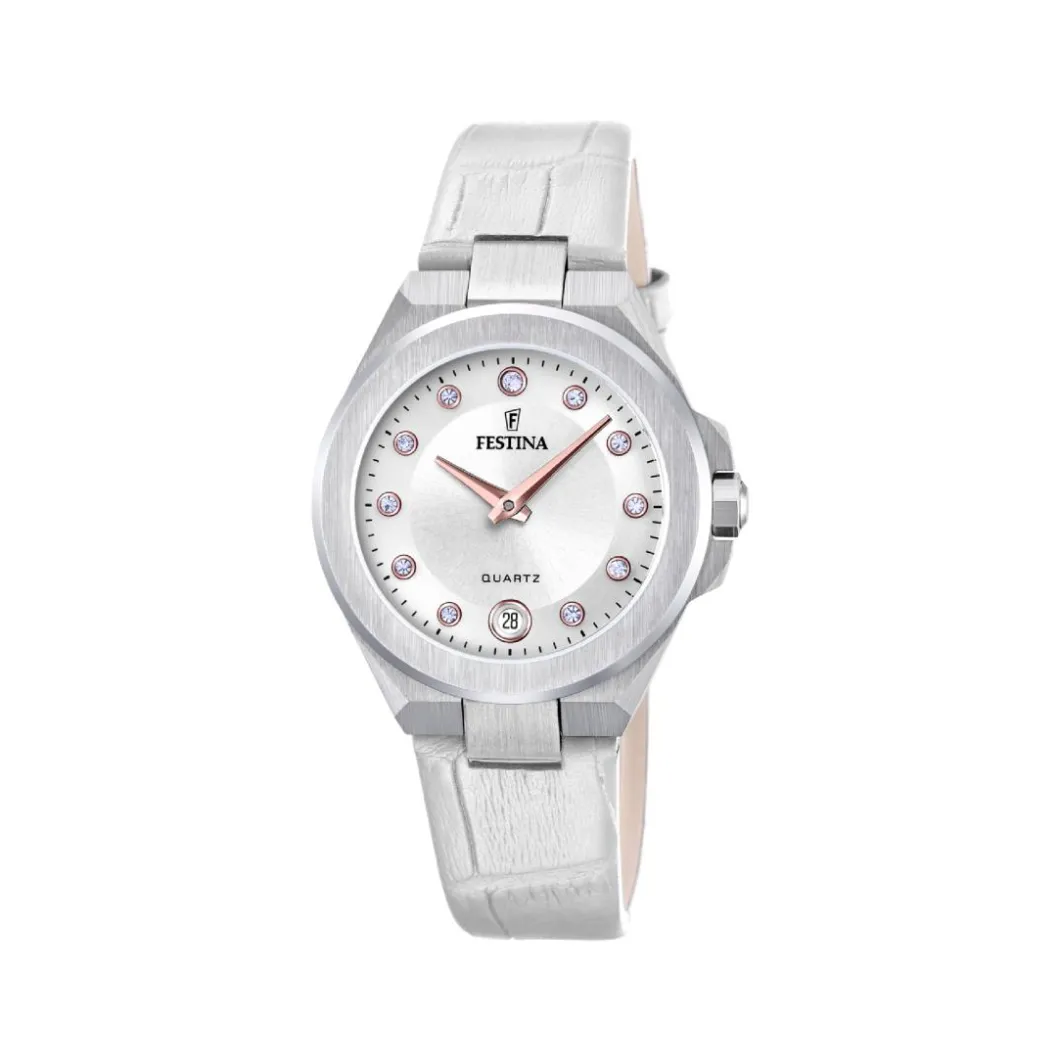 La Mademoiselle F20701-1 est une montre pour femme de la marque Festina. Le boîtier rond de cette montre, en acier, a un diamètre de 33 mm. Son bracelet blanc est conçu en cuir véritable, doté d’une boucle simple pour une fermeture sécurisée. Avec un affichage analogique, cette montre a un mouvement à quartz, garantissant une précision temporelle optimale. Elle est équipée d’une fonction dateur pour un usage quotidien pratique. Son verre minéral renforce sa solidité. La couleur du boîtier est acier, qui s’harmonise parfaitement avec le blanc du bracelet. Cette montre résiste à l’eau jusqu’à une profondeur de 50 mètres.