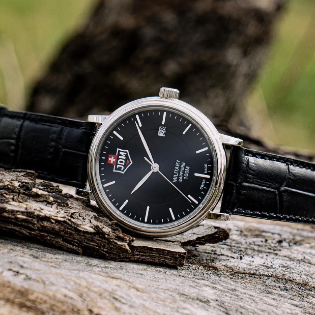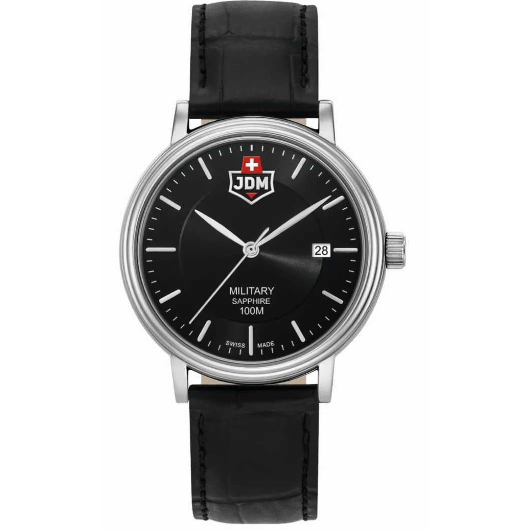 La JDM Military Kilo JDM-WG004-07 est une montre élégante pour homme. Dotée d’une fonction dateur, elle est munie d’un bracelet en cuir de couleur noir. Son boitier rond, d’une couleur argent, est fait d’acier d’une largeur de 40mm. L’affichage est analogique avec un mouvement à quartz. Sa fermeture est de type boucle simple. Avec une étanchéité de 100m, elle est résistante en milieu aquatique. Le verre de cette montre est en saphir, ajoutant une touche de luxe à ce bijou.