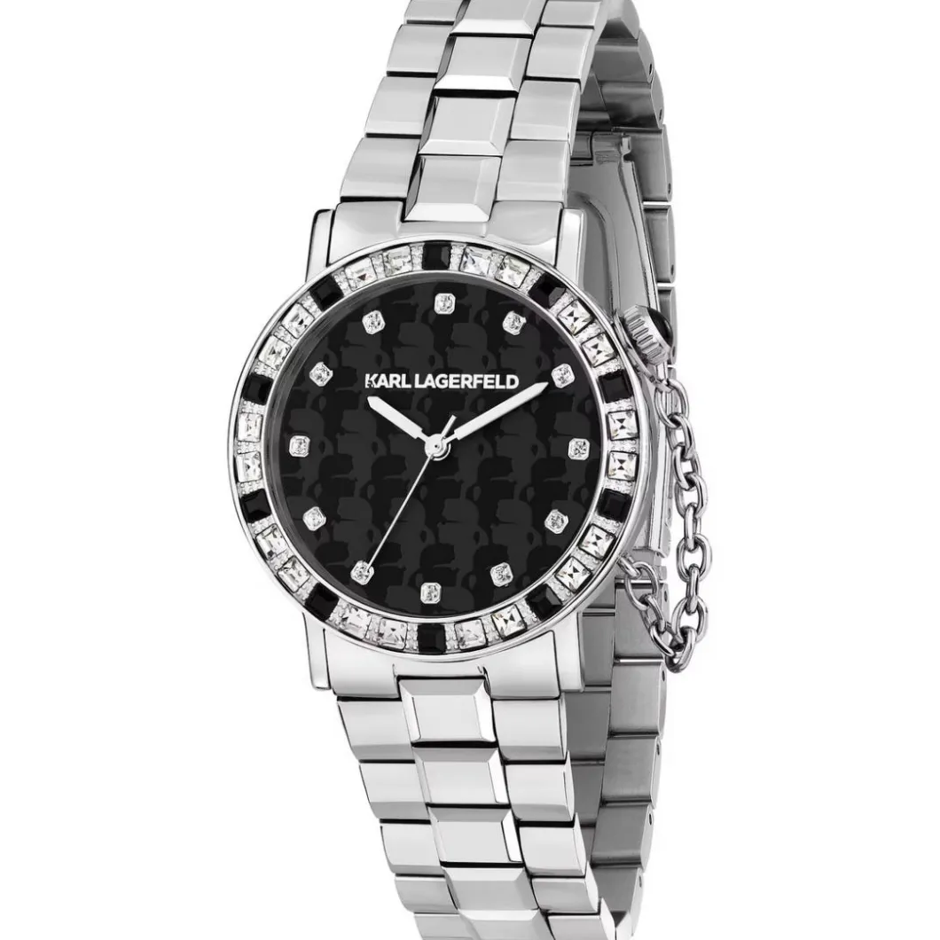 Découvrez la Montre Femme Karl Lagerfeld Crystals – R0553100502 conçue avec un superbe bracelet en acier de couleur argent. Une pièce féminine signée Karl Lagerfeld qui affiche une élégance raffinée. Elle se distingue par son boîtier rond de 33 mm, de couleur noire, en acier, offrant une résistance appréciable. Le verre minéral de cette montre protège un cadran à affichage analogique, mouvement à quartz. Étanche jusqu’à 50 mètres (soit 5ATM), cette montre est équipée d’une boucle déployant pour un confort optimal et une sécurité irréprochable. L’image fournie met en lumière des cristaux incrustés autour du cadran, apportant une touche d’éclat supplémentaire.