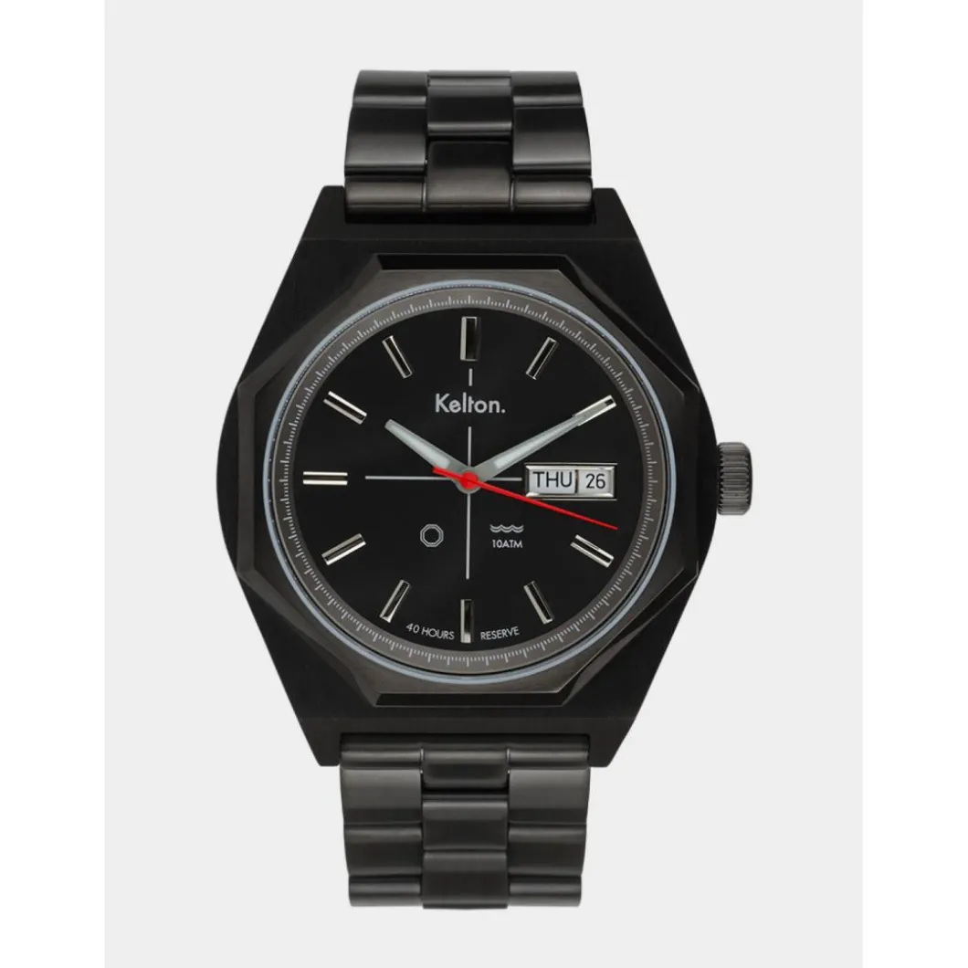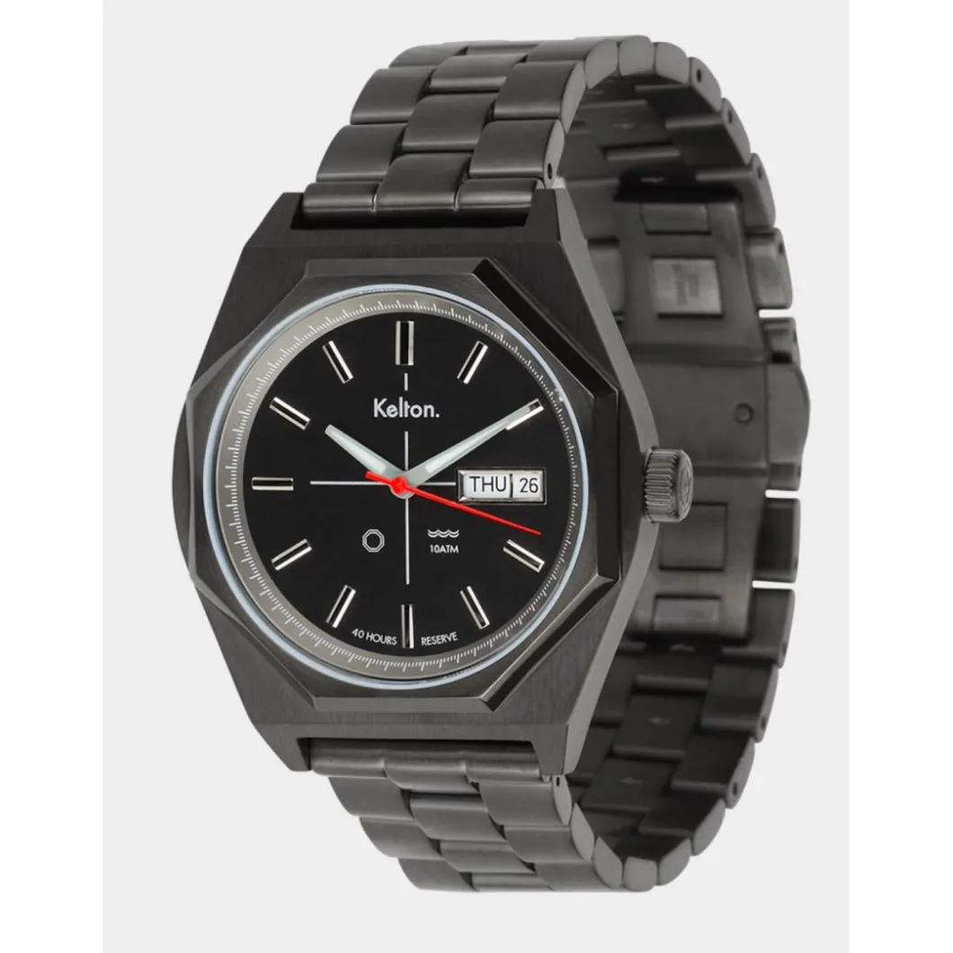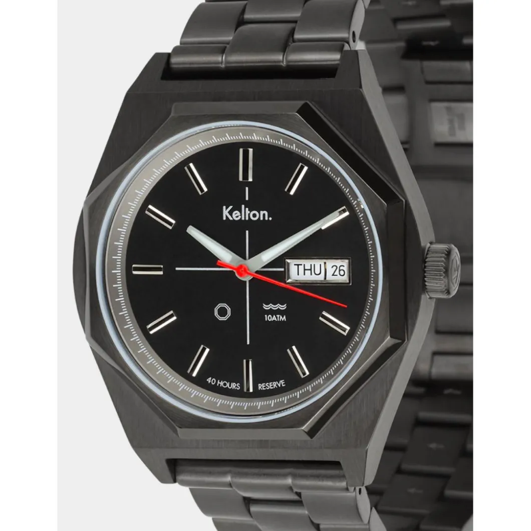 Ici, nous avons optimisé les potentiels immenses de ce modèle Kelton de la fin des années 70. Tout d’abord en re-dessinant son boitier, équipé à présent d’un mouvement automatique jour/date Seagull 1632. Ses aiguilles (heures et minutes) traitées au Superluminova sont devenues luminescentes, enfin, nous avons utilisé un verre saphir et cette petite bombe automatique résiste maintenant à une pression de 10 ATM.