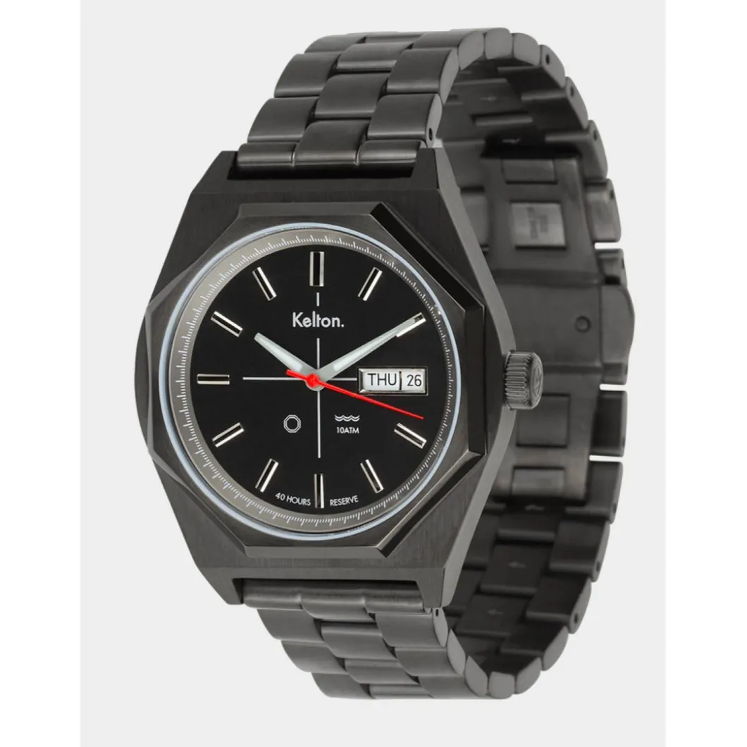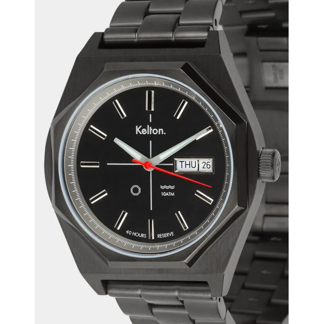 L’Octogone est, depuis que la question du futur hante le cinéma, la forme que prend à peu près tout objet à venir. Cela va des portes (dans les couloirs des vaisseaux) aux vaisseaux eux-mêmes en passant par l’architecture, les robots… D’où cette vague de modèles octogonaux apparue à la fin des décennies Space Age (70’s), chez un grand nombre d’horlogers y compris Kelton, il y en a des centaines.