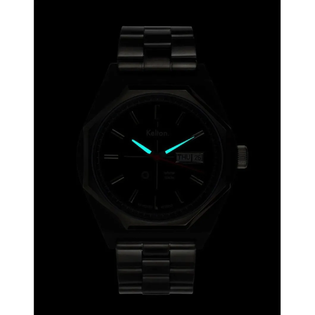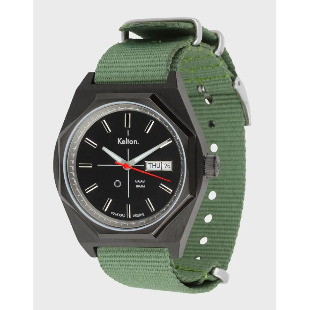 La montre Octogone Titane Nato Kaki au style rétro-futuriste vous souhaite la bienvenue en 2049. Sa version Titane s’adresse aux plus « bad boys » d’entre nous. Ici, nous avons optimisé les potentiels immenses de ce modèle Kelton de la fin des années 70. Tout d’abord en re-dessinant son boitier, équipé à présent d’un mouvement automatique jour/date Seagull 1632. Ses aiguilles (heures et minutes) traitées au Superluminova sont devenues luminescentes, enfin, nous avons utilisé un verre saphir et cette petite bombe automatique résiste maintenant à une pression de 10 ATM. L’Octogone est, depuis que la question du futur hante le cinéma, la forme que prend à peu près tout objet à venir. Cela va des portes (dans les couloirs des vaisseaux) aux vaisseaux eux-mêmes en passant par l’architecture, les robots… D’où cette vague de modèles octogonaux apparue à la fin des décennies Space Age (70’s), chez un grand nombre d’horlogers y compris Kelton, il y en a des centaines. Toutes les montres Kelton sont conçues et assemblées en France.