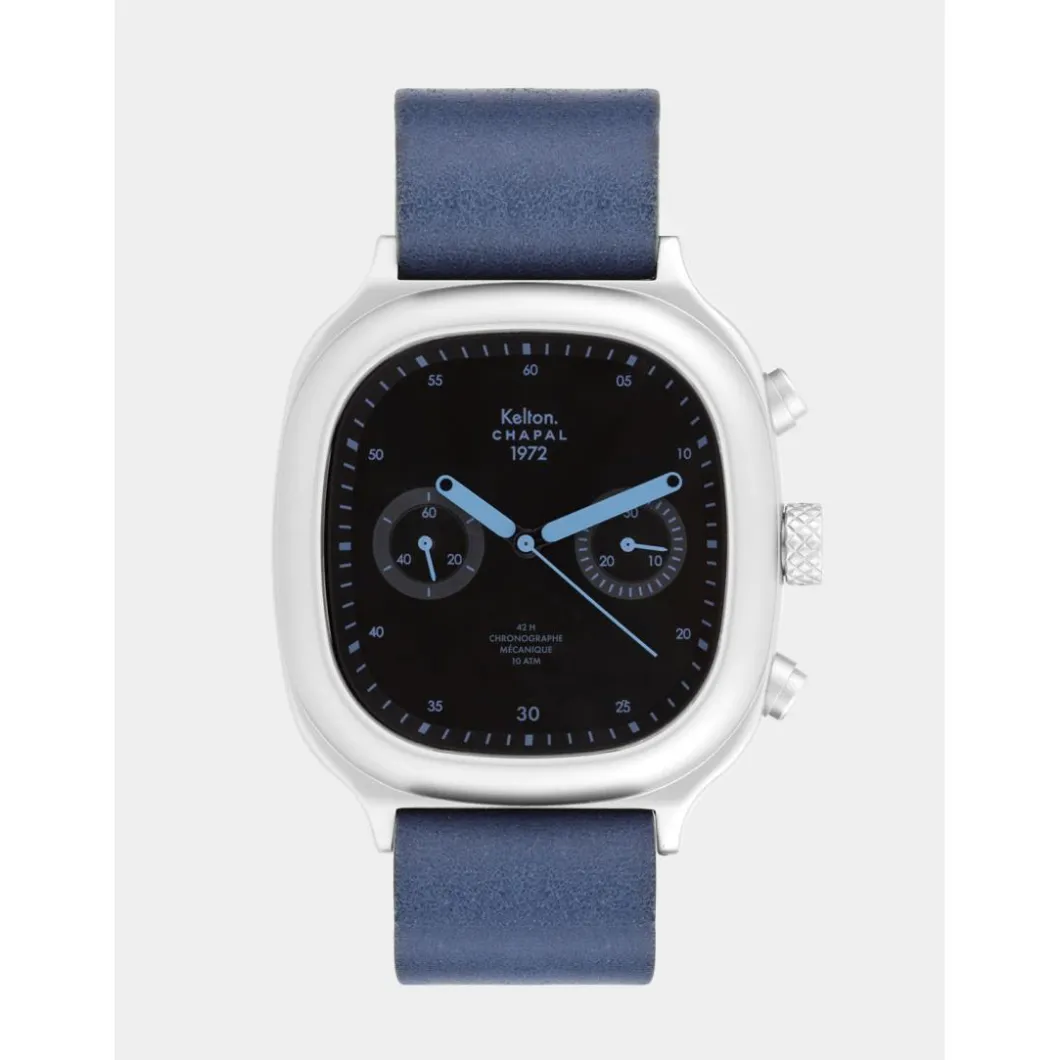 La montre chronographe 1972 Skyblue Kelton x Maison Chapal est une édition limitée et numérotée de 1 à 100.