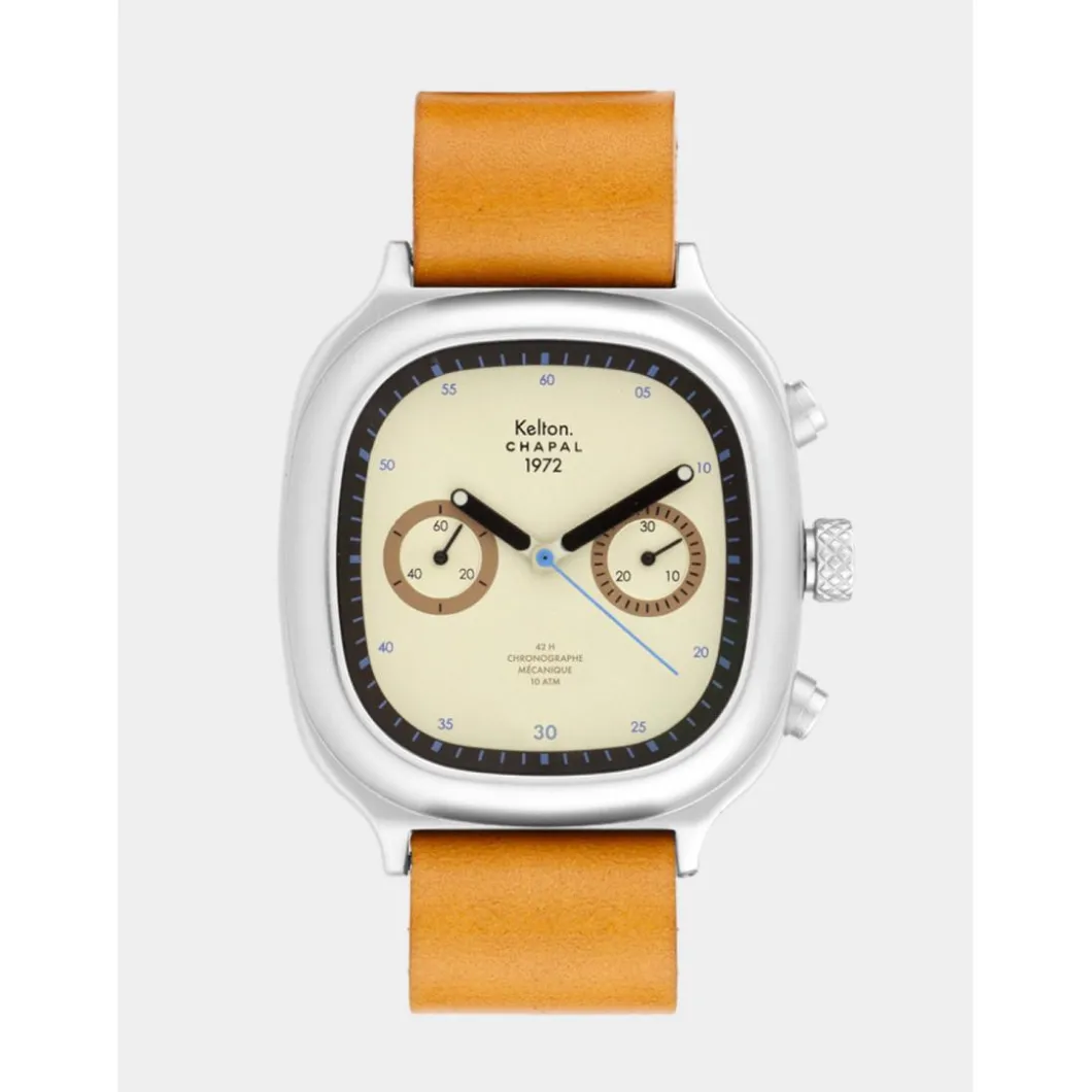 La montre chronographe 1972 Skysand Kelton x Maison Chapal est une édition limitée et numérotée de 1 à 100.
