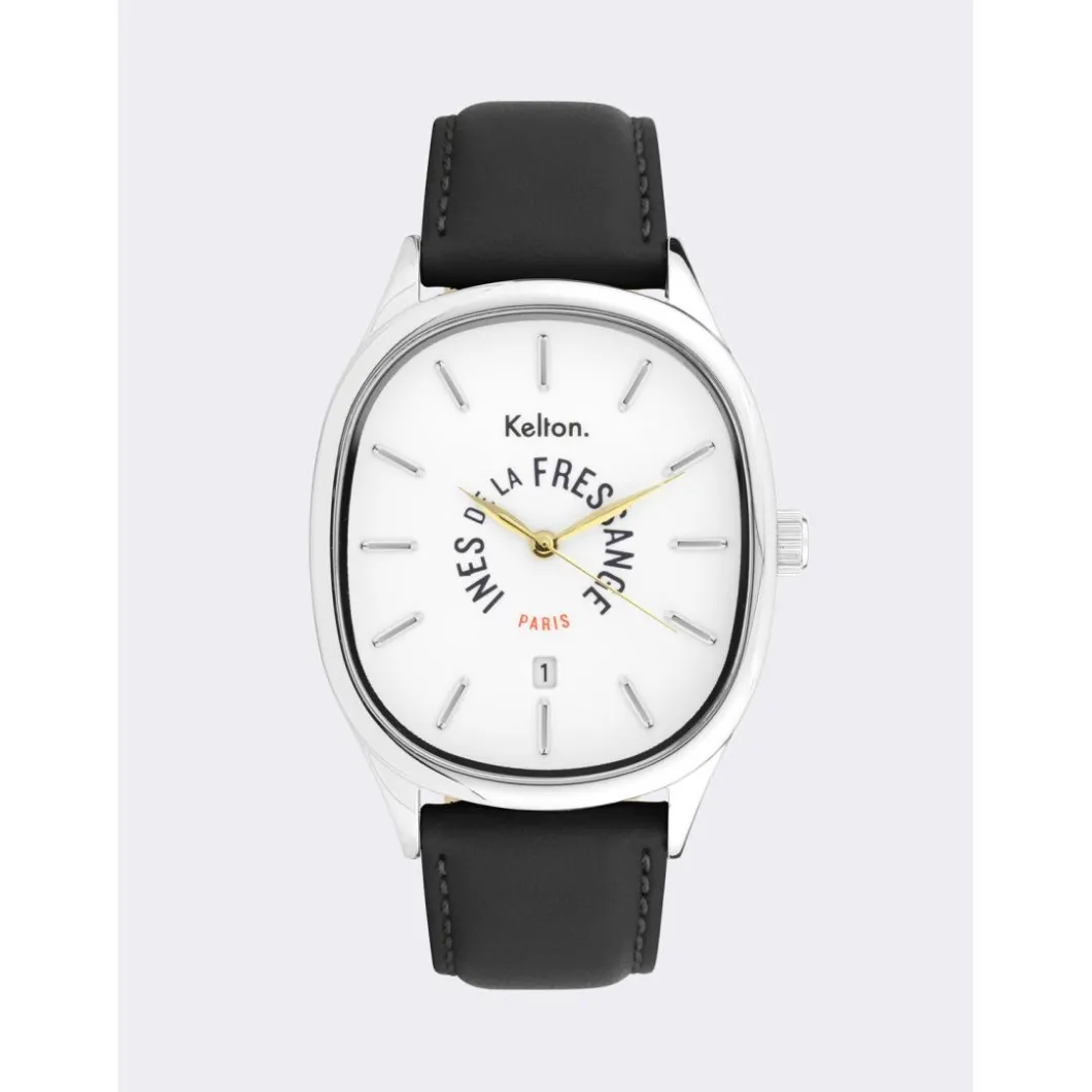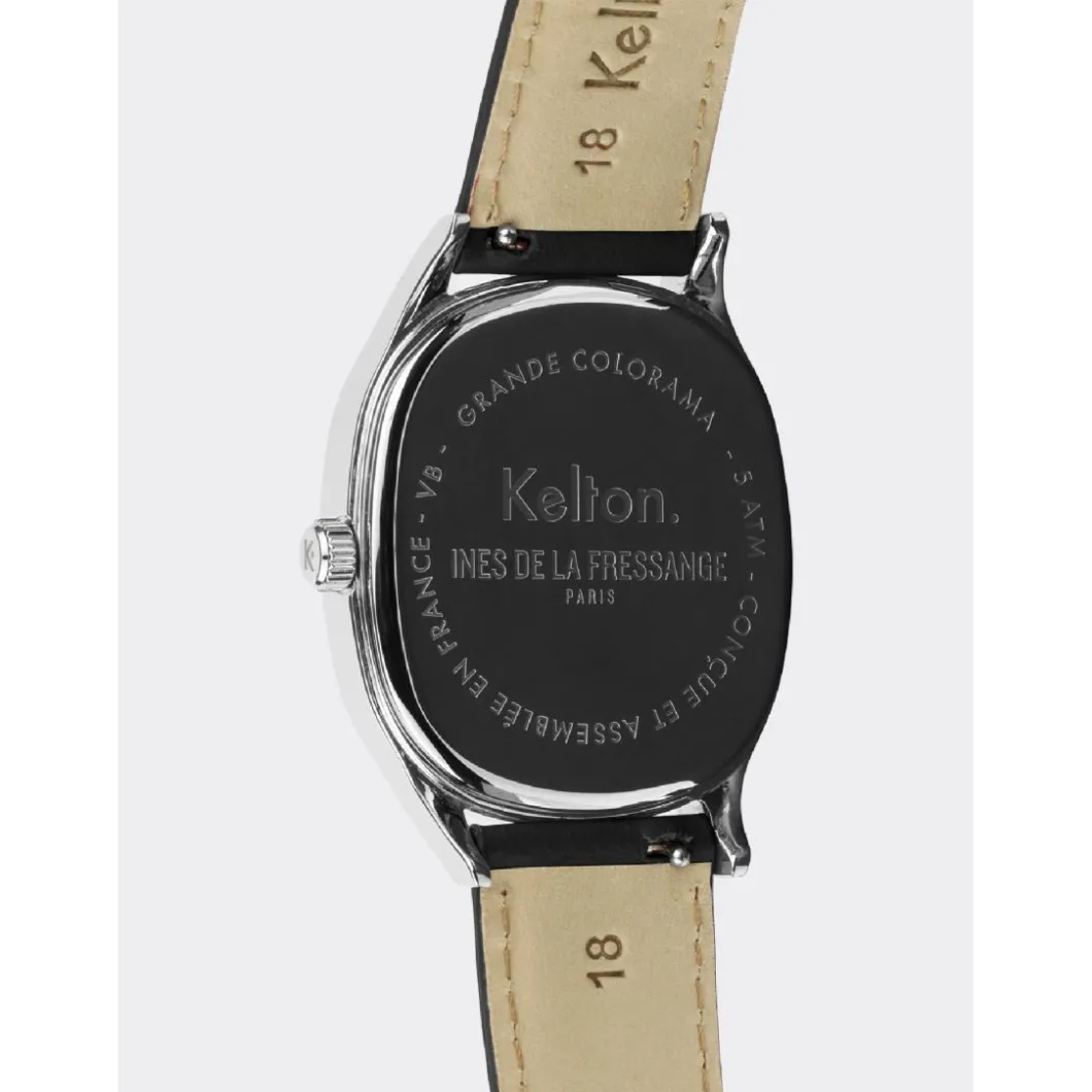 Émanant un charme intemporel et un sens du chic parisien, la montre femme Kelton Grand Colorama Kelton x Ines de la Fressange Paris – 9125452 Noir de marque Kelton se distingue par sa simplicité élégante. Son boîtier en acier de couleur argent est harmonieusement mis en valeur par son bracelet noir en cuir véritable. Cette pièce indémodable abrite un mouvement quartz et affiche l’heure de manière analogique. Le boîtier a un diamètre de 40 mm et l’étanchéité du garde-temps est de 50 mètres (5 ATM). Dotée d’un verre minéral, cette montre possède une boucle simple comme fermeture. Les détails subtils sur la monture tonneau ajoute une aura de sophistication.