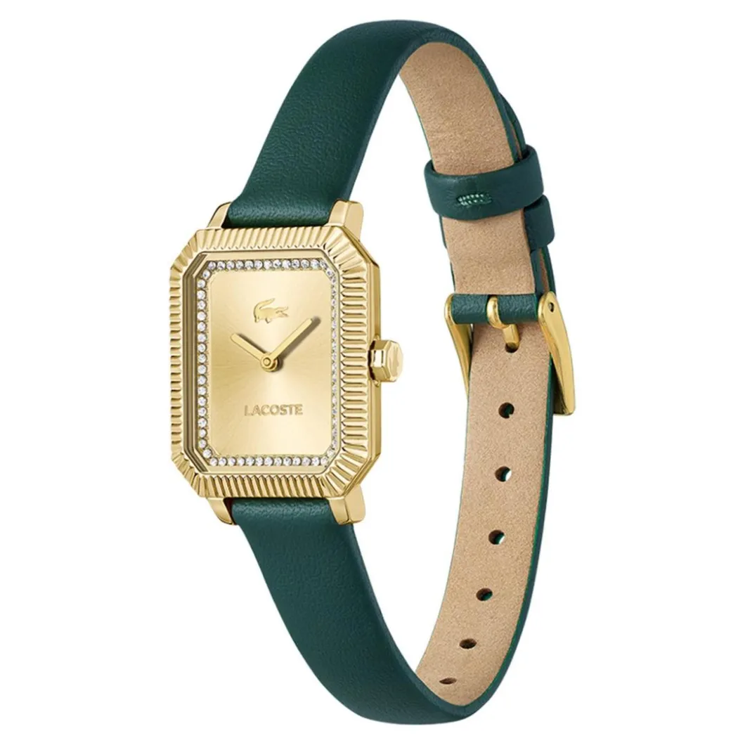 La Montre Femme Lacoste Parisienne – 2001442 est un bijou de la marque réputée Lacoste. Avec un affichage de type analogique, elle propose un boîtier rectangulaire en acier de couleur dorée, dimensions 20 x 27 mm. Son bracelet de couleur verte conjugue durabilité et esthétisme grâce à sa matière en cuir. La boucle simple comme type de fermeture garantit une utilisation pratique. L’étanchéité, non négligeable, est de 30 m (3 ATM) ce qui permet une certaine immersion sans dommage. Notez que son verre minéral offre une excellente résistance aux rayures. Elle fonctionne à quartz pour une exactitude irréprochable du temps. Plein d’élégance, cet accessoire ajoute une touche chic et décontractée à chaque tenue.