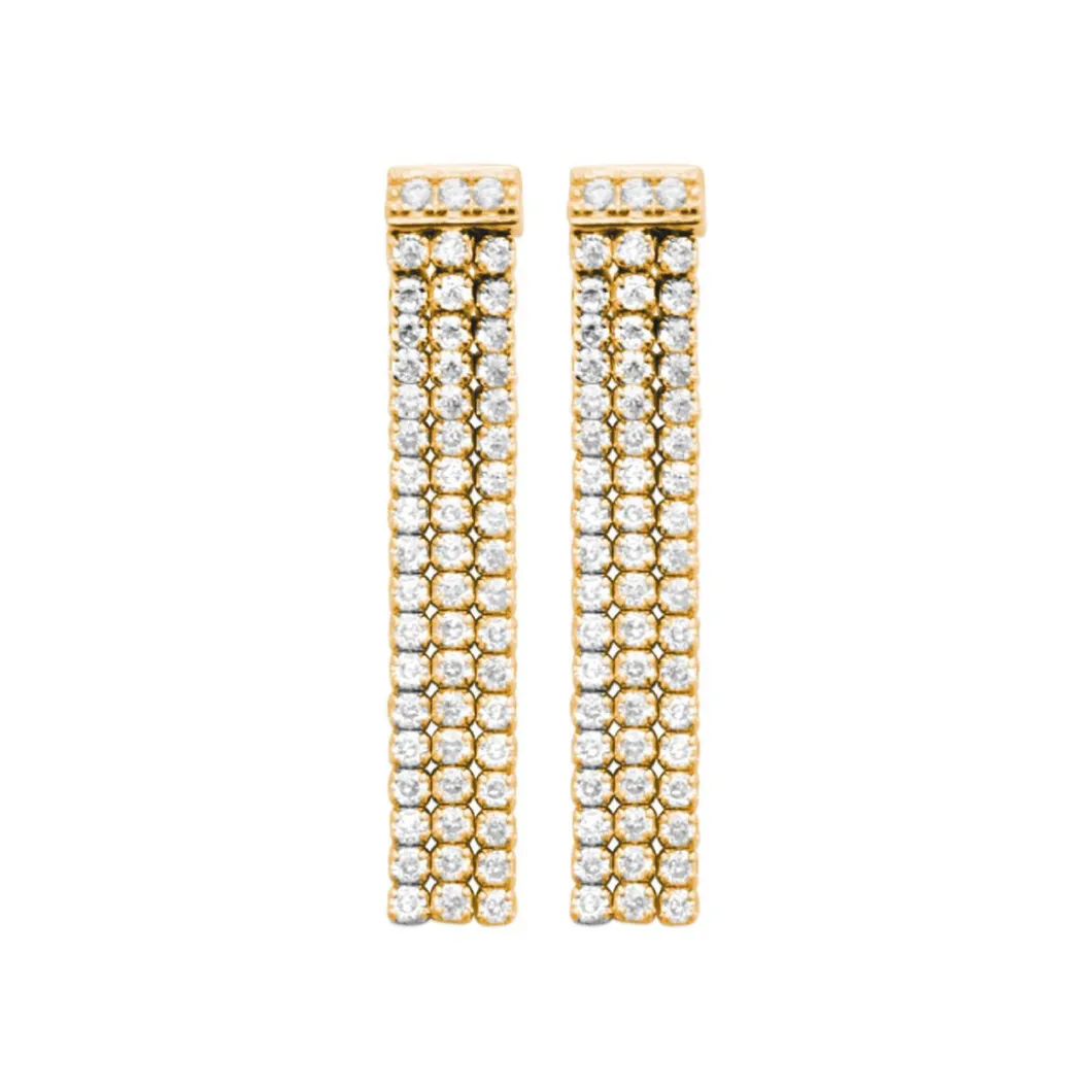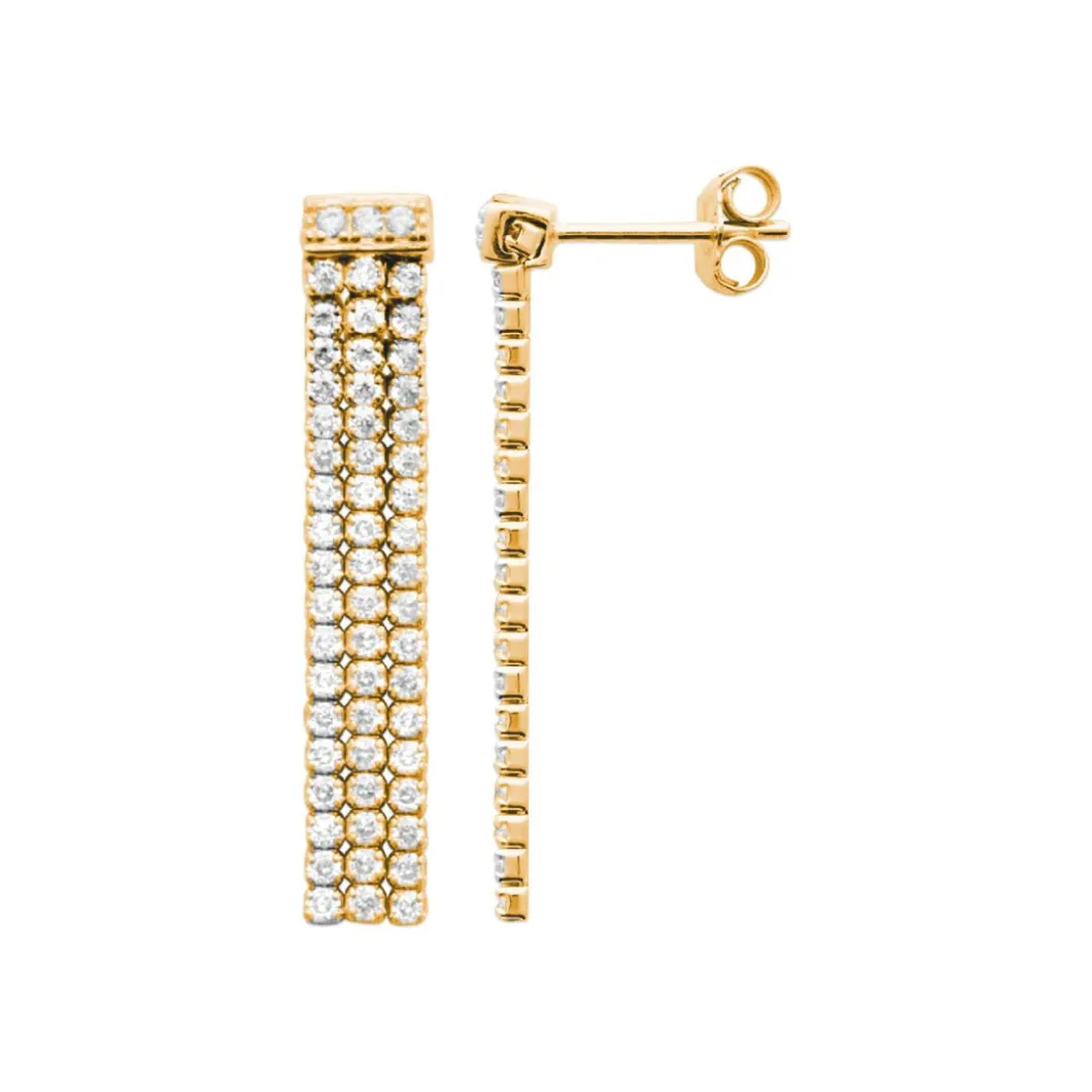 Adoptez le design glamour de ces Pendantes Y5565Z0 pensées par la Maison de la Bijouterie. Elles illuminent le visage subtilement avec leurs trois rangées de zircons blancs montés dans du laiton 750/1000.