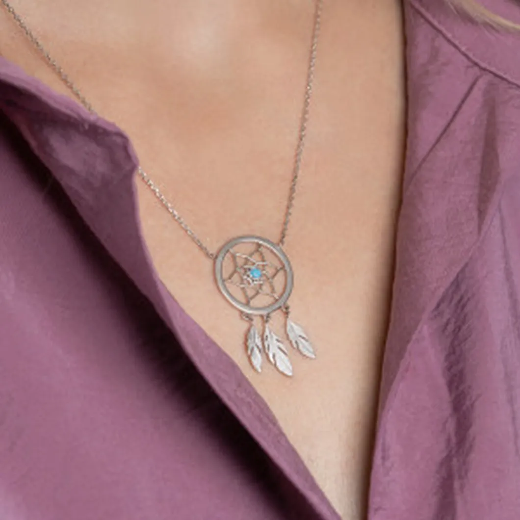 Gardez vos rêves près de votre cœur grâce à ce Collier Femme VWZW5W45 de chez Maison de la Bijouterie. Il propose un magnifique pendentif attrape-rêve joliment rehaussé d’une pierre bleue et de trois plumes.