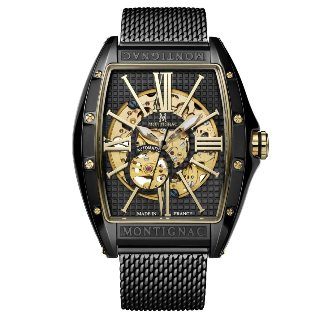 Autour de quatre formes puissantes qui puisent leur inspiration aussi bien dans les canons horlogers séculaires, que dans les marques d’avant-garde, Montignac offre une alchimie unique où l’automatique est maître. Un modèle automatique en 5 ou 10 ATM à couronne vissée à un prix aussi accessible est une opportunité pour le consommateur. La puissance du design s’exprime au travers d’une architecture moderne. Là, un cadran classique conjugue l’or rose au noir profond, créant une tension esthétique à nulle autre pareille. Ailleurs, le cadran s’efface pour dévoiler la technicité du mouvement automatique, dont chaque rouage peut être admiré dans ses moindres détails. Les tons de l’or rose se reflètent dans des dégradés de bleu, vert, noir ou gris. Au gré de compositions issues du bureau d’études de Montignac, chaque personnalité s’affirmera en fonction d’un style unique, où la quête de performance mécanique, s’alliant à un design puissant.