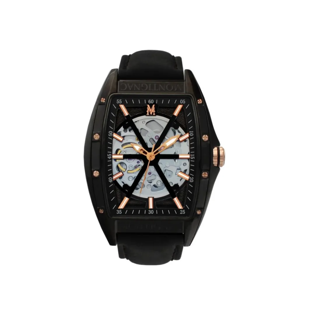 Autour de quatre formes puissantes qui puisent leur inspiration aussi bien dans les canons horlogers séculaires, que dans les marques d’avant-garde, Montignac offre une alchimie unique où l’automatique est maître. Un modèle automatique en 5 ou 10 ATM à couronne vissée à un prix aussi accessible est une opportunité pour le consommateur. La puissance du design s’exprime au travers d’une architecture moderne. Là, un cadran classique conjugue l’or rose au noir profond, créant une tension esthétique à nulle autre pareille. Ailleurs, le cadran s’efface pour dévoiler la technicité du mouvement automatique, dont chaque rouage peut être admiré dans ses moindres détails. Les tons de l’or rose se reflètent dans des dégradés de bleu, vert, noir ou gris. Au gré de compositions issues du bureau d’études de Montignac, chaque personnalité s’affirmera en fonction d’un style unique, où la quête de performance mécanique, s’alliant à un design puissant.