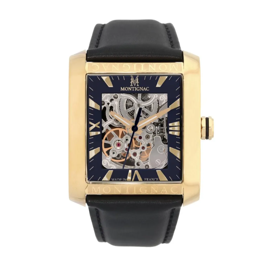 Autour de quatre formes puissantes qui puisent leur inspiration aussi bien dans les canons horlogers séculaires, que dans les marques d’avant-garde, Montignac offre une alchimie unique où l’automatique est maître. Un modèle automatique en 5 ou 10 ATM à couronne vissée à un prix aussi accessible est une opportunité pour le consommateur. La puissance du design s’exprime au travers d’une architecture moderne. Là, un cadran classique conjugue l’or rose au noir profond, créant une tension esthétique à nulle autre pareille. Ailleurs, le cadran s’efface pour dévoiler la technicité du mouvement automatique, dont chaque rouage peut être admiré dans ses moindres détails. Les tons de l’or rose se reflètent dans des dégradés de bleu, vert, noir ou gris. Au gré de compositions issues du bureau d’études de Montignac, chaque personnalité s’affirmera en fonction d’un style unique, où la quête de performance mécanique, s’alliant à un design puissant.