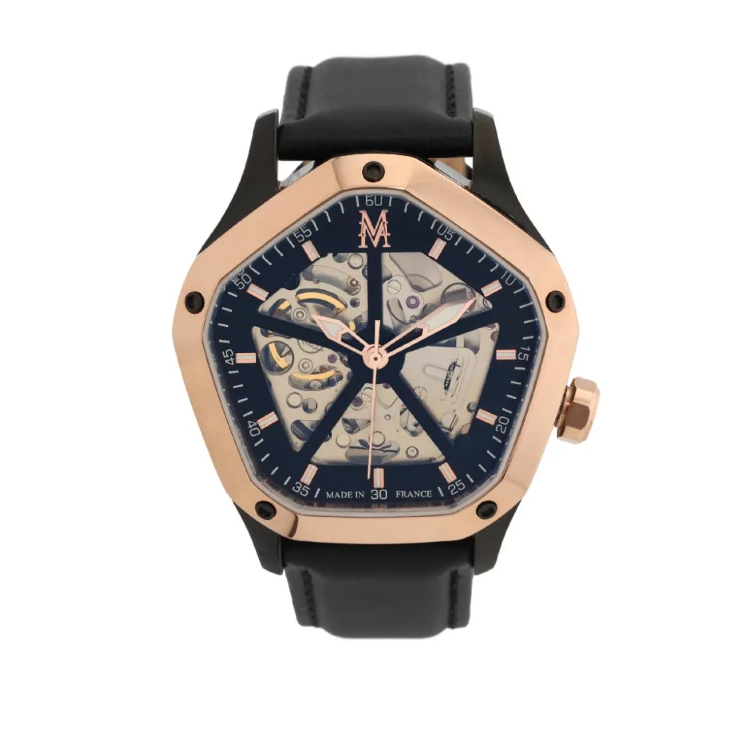 Autour de quatre formes puissantes qui puisent leur inspiration aussi bien dans les canons horlogers séculaires, que dans les marques d’avant-garde, Montignac offre une alchimie unique où l’automatique est maître. Un modèle automatique en 5 ou 10 ATM à couronne vissée à un prix aussi accessible est une opportunité pour le consommateur. La puissance du design s’exprime au travers d’une architecture moderne. Là, un cadran classique conjugue l’or rose au noir profond, créant une tension esthétique à nulle autre pareille. Ailleurs, le cadran s’efface pour dévoiler la technicité du mouvement automatique, dont chaque rouage peut être admiré dans ses moindres détails. Les tons de l’or rose se reflètent dans des dégradés de bleu, vert, noir ou gris. Au gré de compositions issues du bureau d’études de Montignac, chaque personnalité s’affirmera en fonction d’un style unique, où la quête de performance mécanique, s’alliant à un design puissant.