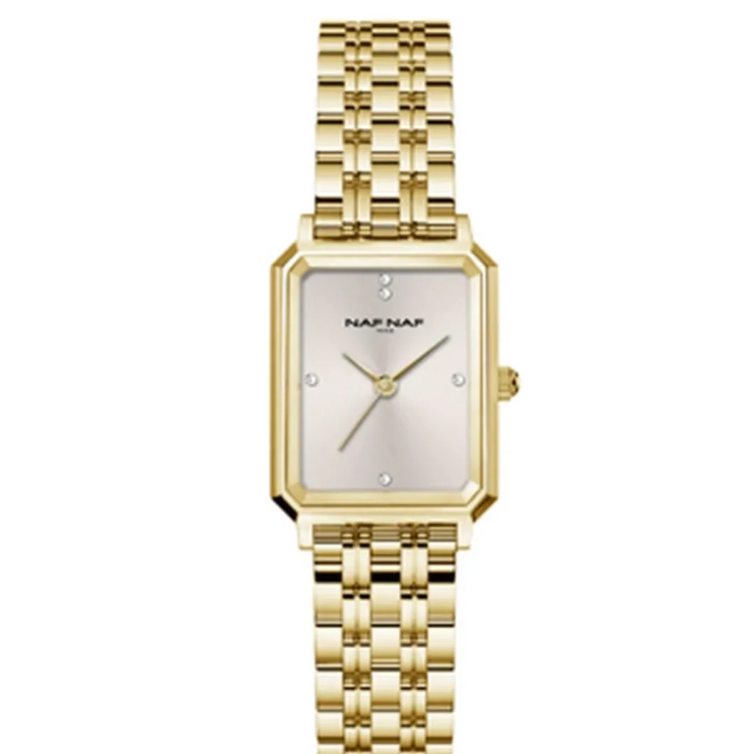 La Naf Naf – NAFW1026 est une montre femme élégante avec un design spectaculairement chic. Le boitier rectangulaire de 22 x 32 mm est fabriqué en acier, tout comme le bracelet. La couleur dorée du bracelet parfaitement assortie à celle du boitier donne à cette pièce une allure luxueuse. L’affichage analogique, alimenté par un mouvement à quartz, est protégé par un verre minéral. Le fermoir de type boucle déployante sécurise solidement la montre. Ses finitions minutieuses et l’éclat subtil du métal doré font de cette montre un véritable bijou pour les femmes. Faites placer votre poignet sous le feu des projecteurs avec cette incroyable montre Naf Naf.