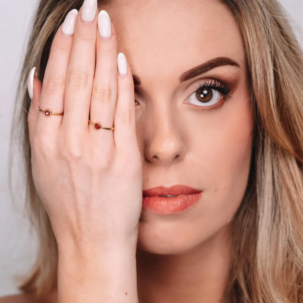 Le plaquage or 18 carats offre à la bague Gemia une lueur chaleureuse et intemporelle, rehaussant la beauté naturelle de la gemme de Grenat. Cet équilibre parfait entre un design épuré et des matériaux de haute qualité en fait un joyau unique.