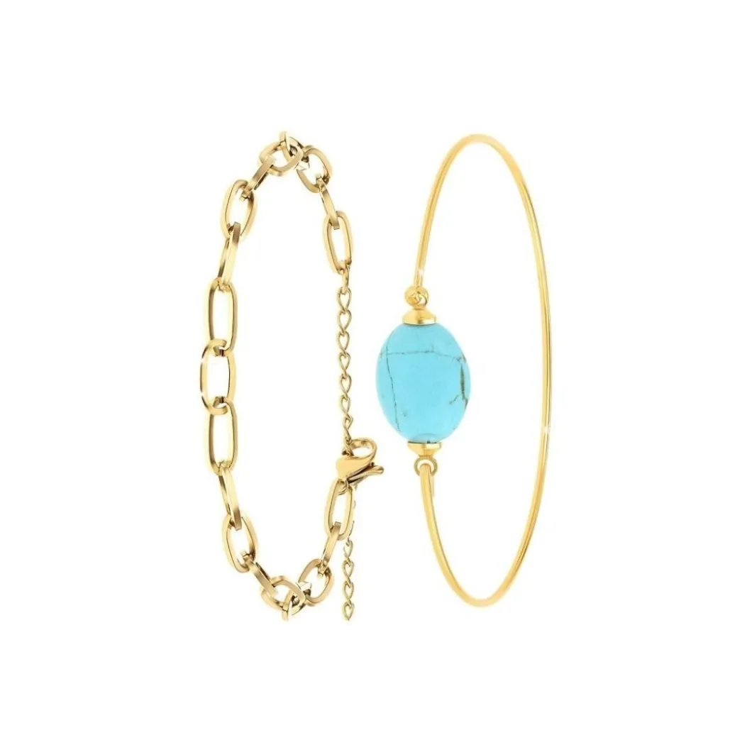 Offrez-vous une allure raffinée avec ce bracelet féminin de la marque So Charm. Le modèle B2369-DORE+B2492-TURQUOISE est un superbe bracelet mode en acier au fini doré, sublimé par la présence d’une pierre turquoise. Son design épuré, moderne et élégant confère un style chic et glamour à la femme qui le porte. Le bracelet est de type jonc, affirmant un look sophistiqué et élégant. La pierre de couleur turquoise apporte une note de fraîcheur et d’originalité. Fait en acier de qualité, ce bijou propose une durabilité optimale. Parfait pour toutes occasions, il sera le meilleur allié de votre élégance.