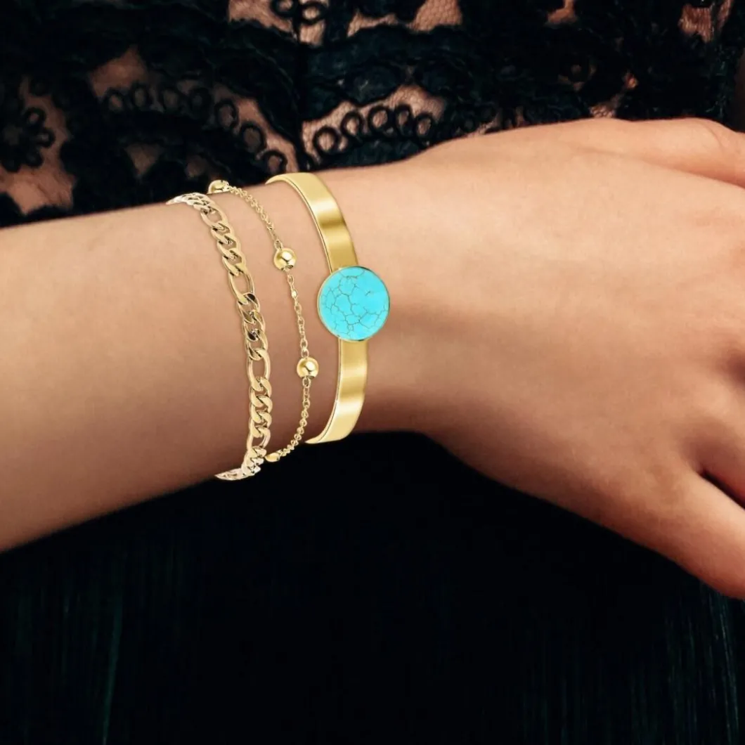Ce bracelet So Charm B2371-DORE+B2384-DORE+B2494-TURQUOISE est un bijou haut de gamme pour femmes. Composé dans un acier brillant, il est orné de magnifiques pierres de couleur Turquoise vibrant de l’éclat unique de cette pierre. Le design de ce bracelet témoigne d’un réel souci de l’artisanat et est parfait pour orner le poignet avec un éclat élégant. Le choix de l’acier comme matière de base assure une durabilité et une résistance à toute épreuve face au temps. A la fois discret et saisissant, ce bracelet élégant est l’accessoire idéal pour compléter avec brio une tenue décontractée ou plus chic.