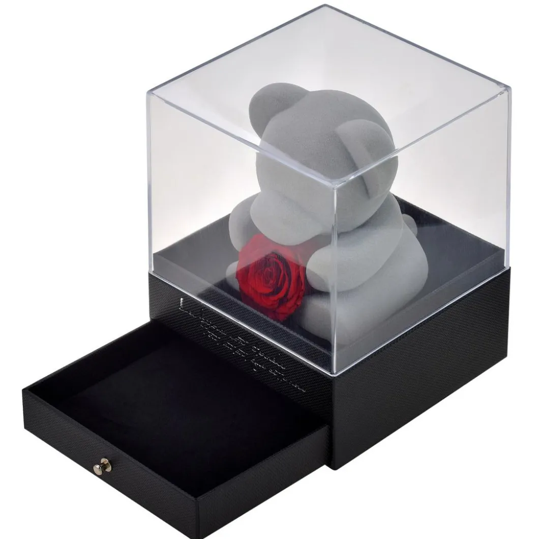 Cette boite à bijoux avec un ourson et une rose éternelle naturelle