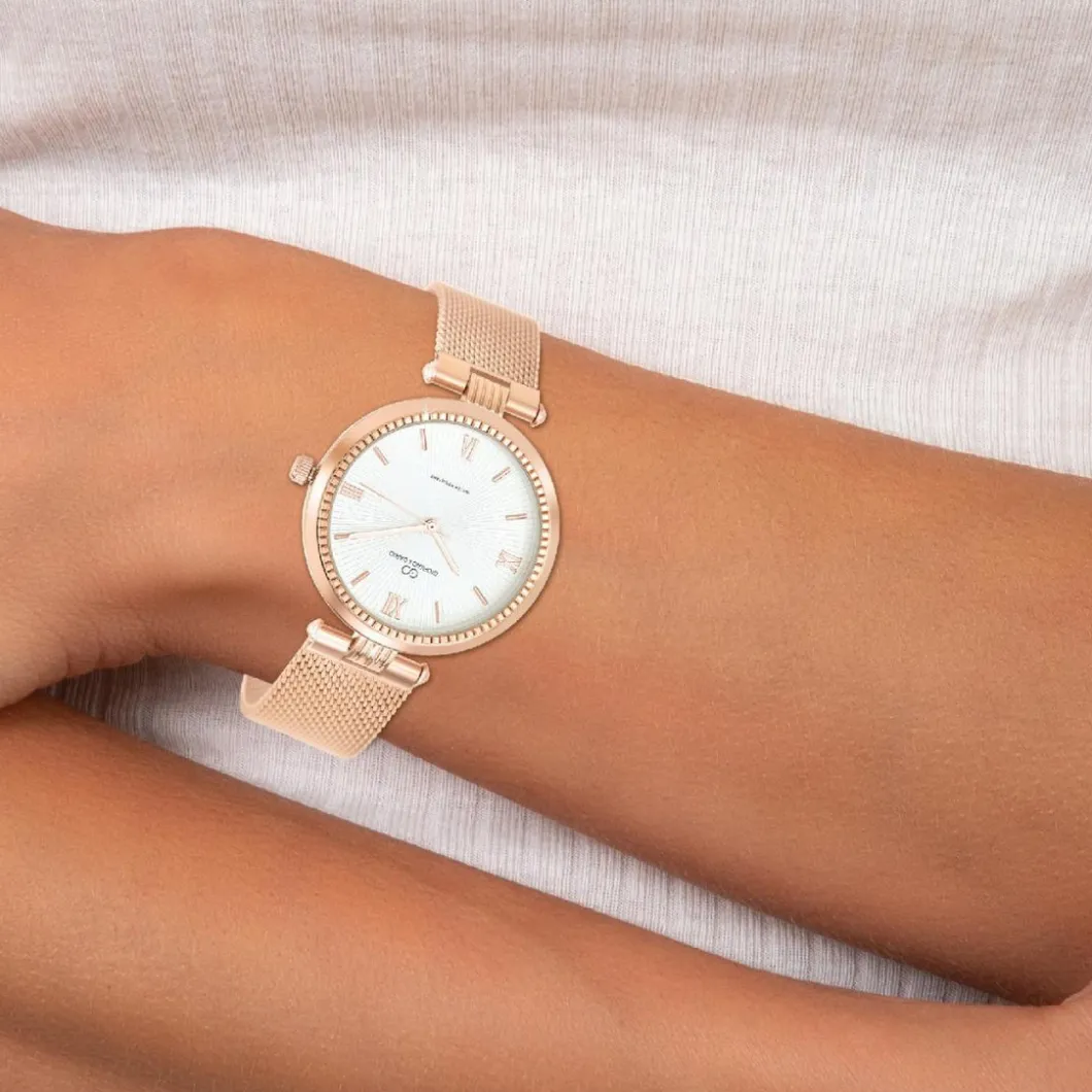 Splendide montre pour femme de la marque So Charm. Son boitier étincelant aux teintes doré rose crée un bel effet chic et glamour. Son diamètre est de 36 mm ce qui la rend proportionnée et agréable à porter. Le bracelet, d’une largeur de 16 mm, complète parfaitement ce bijou empreint de sophistication. Une pièce raffinée qui saura plaire aux amatrices de montres élégantes.