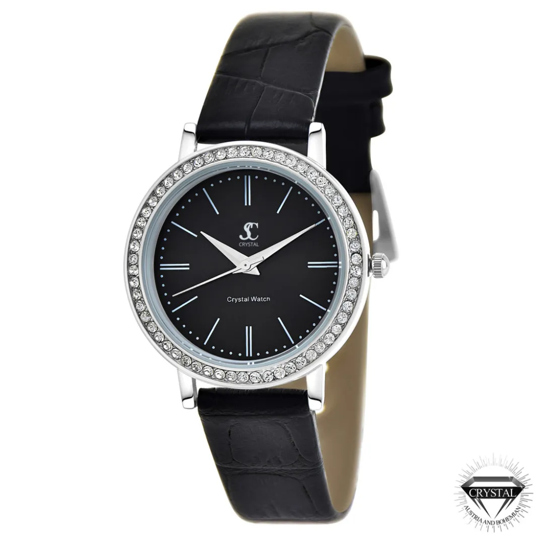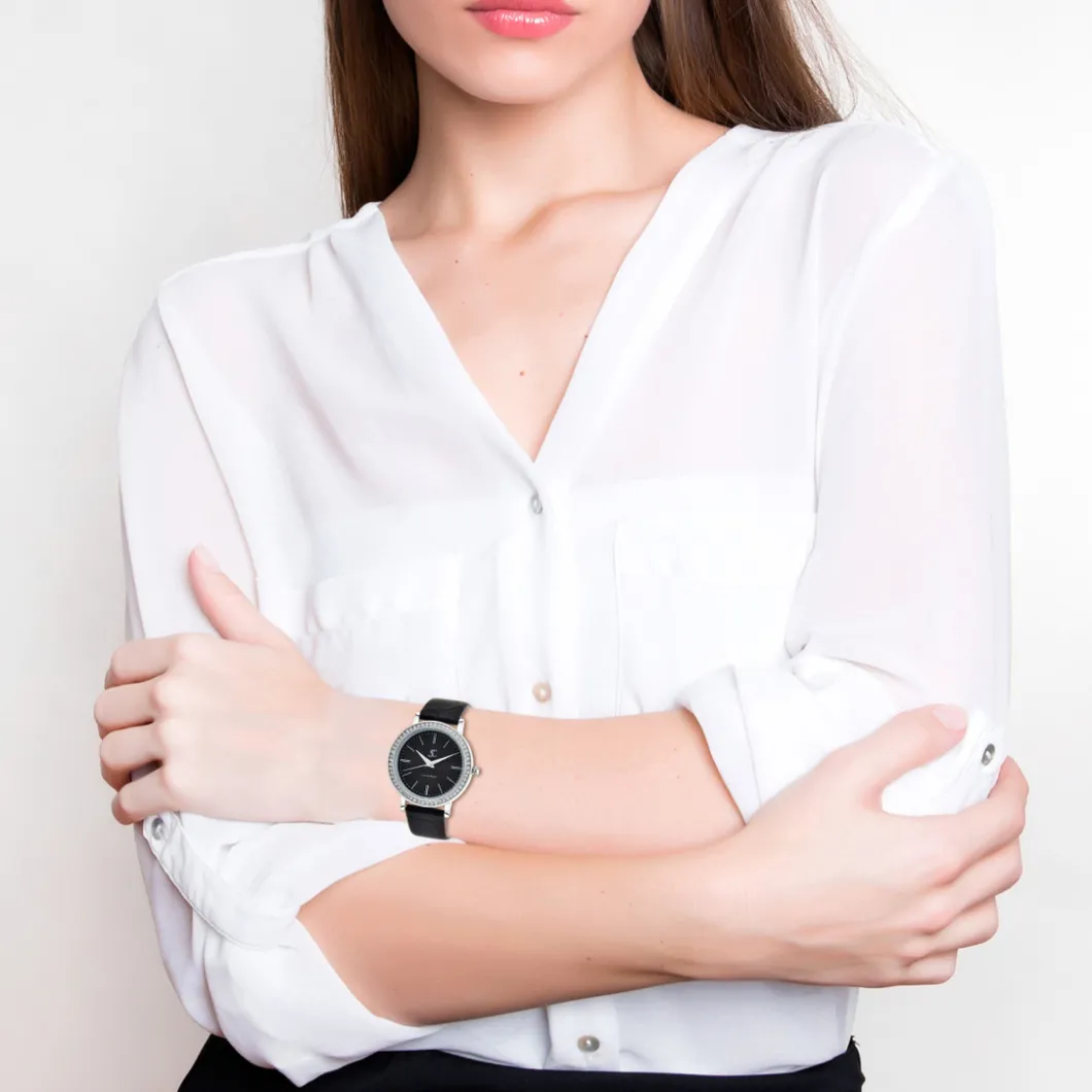 La Montre MF414-NFN – So Charm est pleine de charme. Son bracelet en cuir noir discret laisse place à un fabuleux boîtier brillant orné de plusieurs cristaux sur les bords.