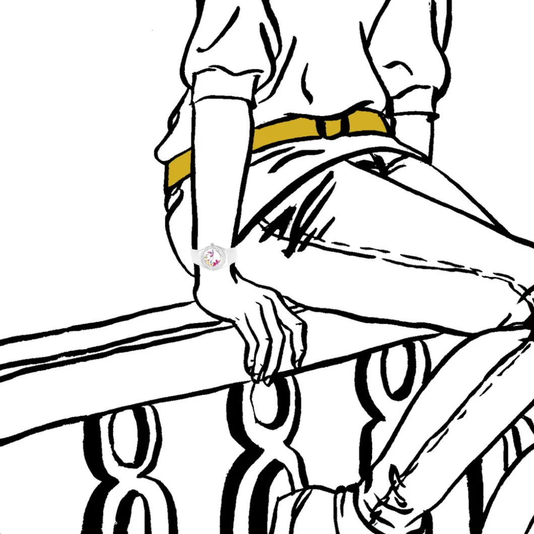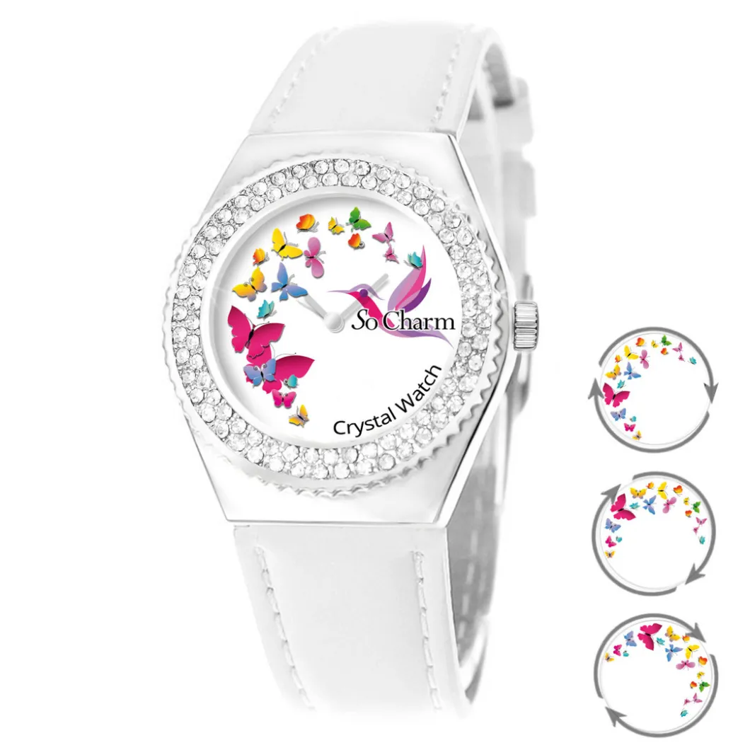 Montre So Charm MF316-PAPILLON-COLIBRI Femme avec bracelet en cuir blanc, boîtier acier argenté et cadran blanc motif oiseau et papillons.