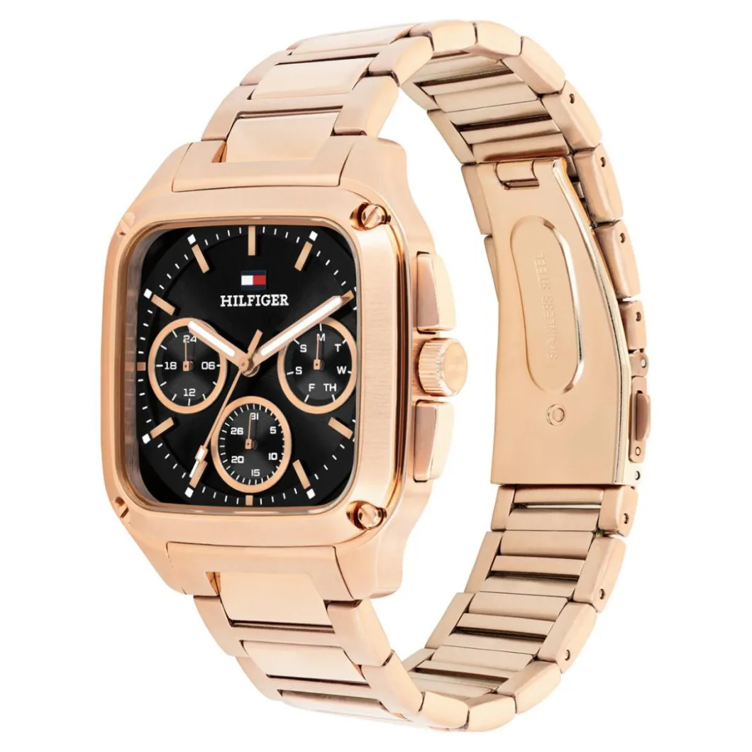 Savourez l’élégance intemporelle de la Montre Homme Tommy Hilfiger Herald – 1792224 avec son bracelet en acier doré rose. Offrant un affichage analogique précis, elle arbore une couleur Doré rose sur son boîtier rectangulaire de 39 mm de diamètre, fabriqué en acier. Le bracelet en acier s’harmonise parfaitement avec la couleur doré rose du boîtier pour un look chic et moderne. Cette montre, alimentée par un mouvement quartz, est étanche jusqu’à 50 mètres (5ATM), ajoutant à la fois du style et de la fonctionnalité à votre poignet. Elle dispose d’une boucle déployante et d’un verre minéral pour une durabilité accrue. C’est certainement une pièce incontournable pour tout homme de goût.