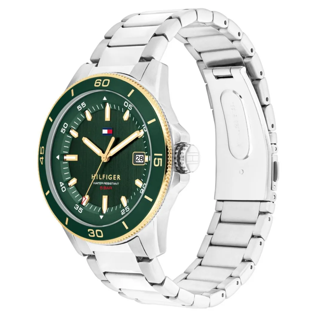 La Montre Homme Tommy Hilfiger Remy – 1792230 est un choix idéal pour les hommes élégants. Avec son affichage analogique et son mouvement quartz, c’est un modèle de précision horlogère. Sa couleur Argent lui confère une allure classique et intemporelle. Son bracelet est composé d’acier tandis que le boitier rond de 43mm est en aluminium de couleur vert, pour une touche d’individualité. L’étanchéité de 50 m (5ATM) est parfaite pour la natation. Sa boucle déployante et le verre minéral ajoutent à la durabilité de cette pièce. La photo montre également une marque discrète sur le cadran et des index subtils pour donner une image de raffinement et de sophistication. Ainsi, cette montre est plus qu’un outil fonctionnel, c’est aussi une mise à jour élégante de votre style.