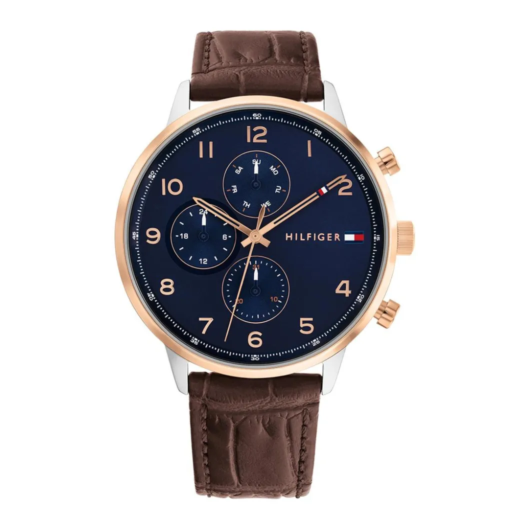 Cette montre homme Tommy Hilfiger arbore un boîtier argenté de 44 mm de diamètre, contrasté par des détails dorés roses. Ses fonctionnalités multifonctions ajoutent une touche de praticité à cette pièce élégante et moderne. Avec son design soigné, elle est idéale pour apporter une note raffinée à votre poignet.